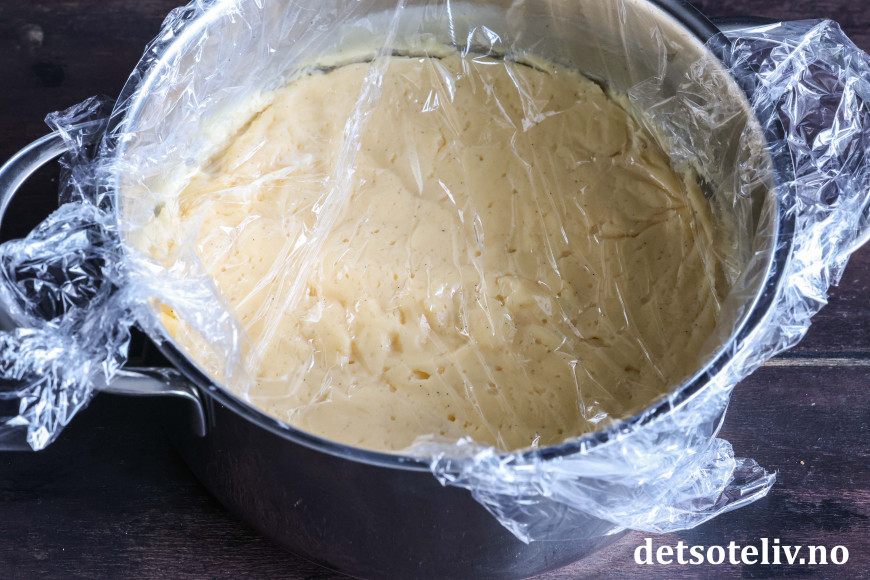La eggekremen avkjøles og dekk den så til med plastfolie. Sett i kjøleskapet til dagen etter.