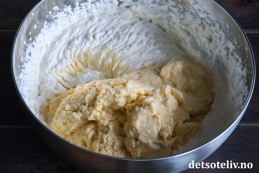 Vend forsiktig inn den kalde, stivnede eggekremen (ikke rør mer enn nødvendig for å få vaniljekremen blandet, se tips).