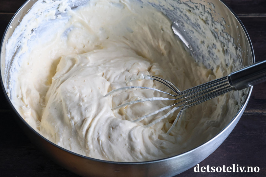 Dagen etter piskes kremfløten til tykk og fast fløtekrem.