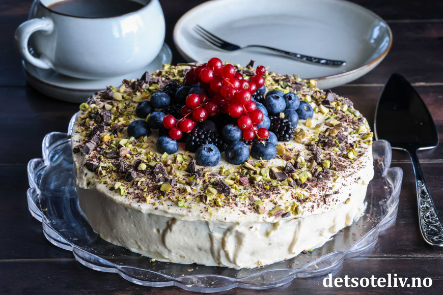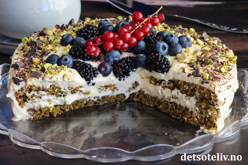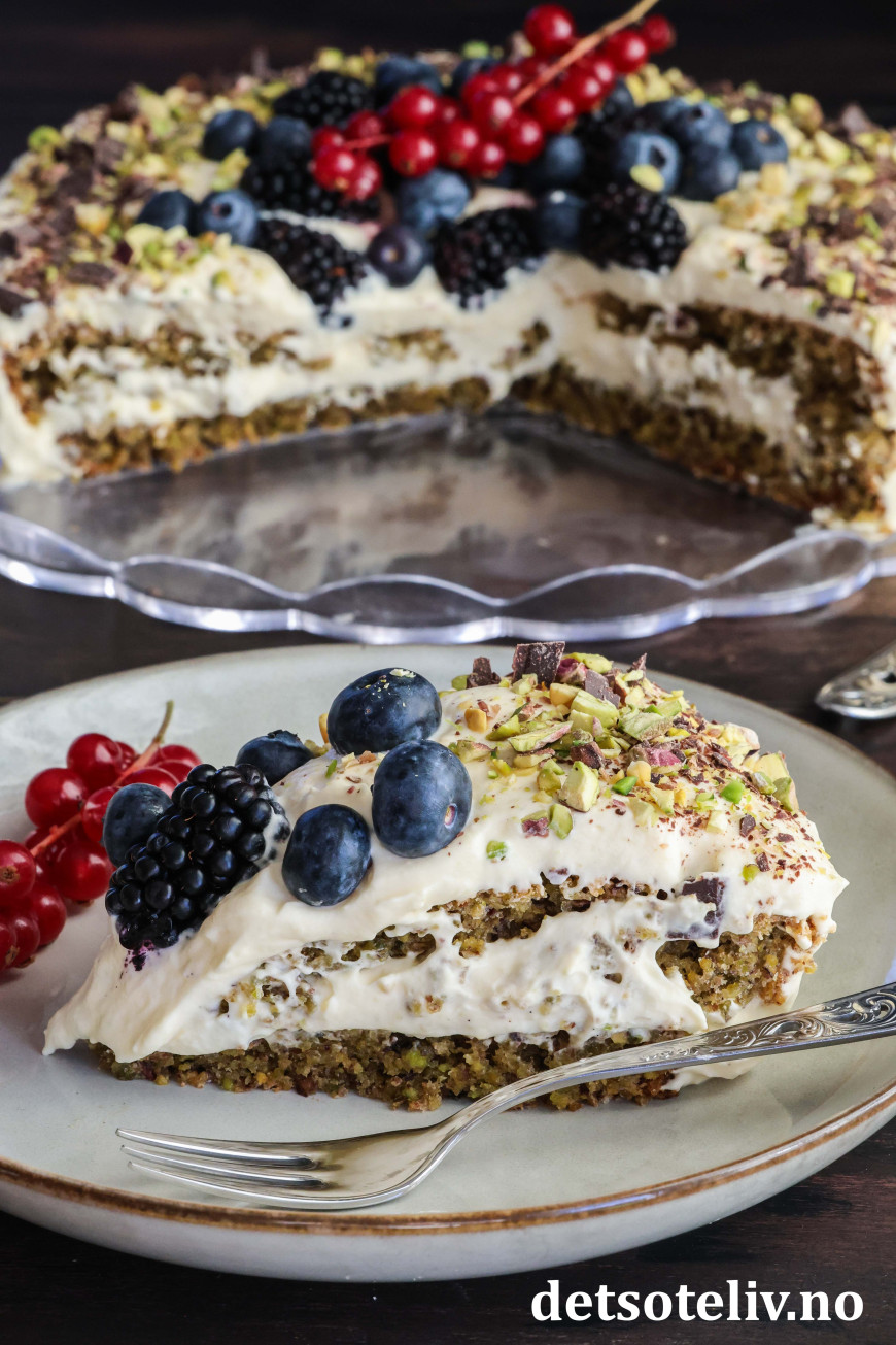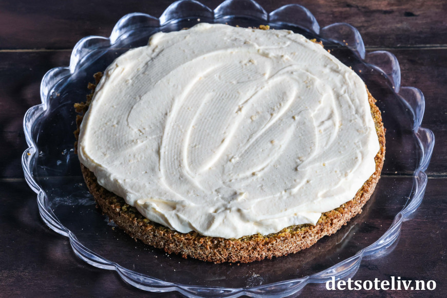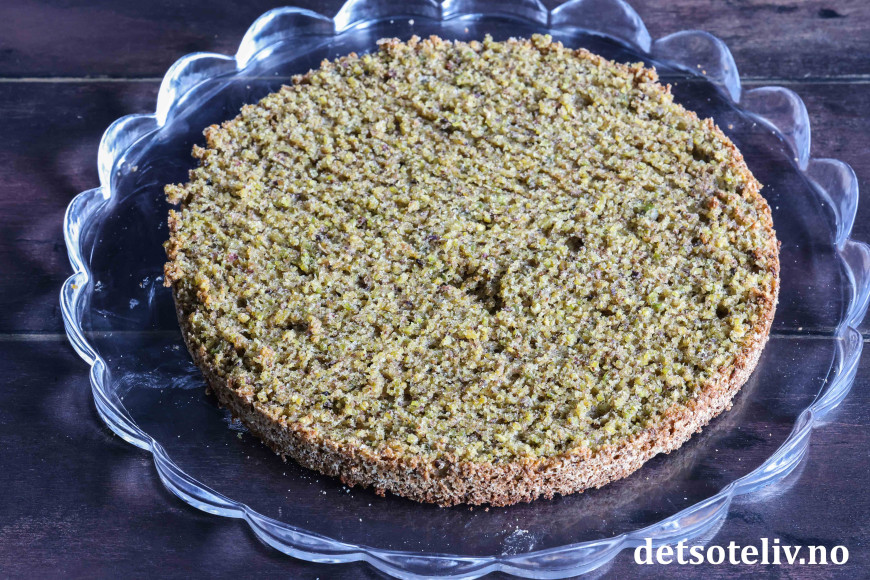 Her får du oppskrift på en kjempegod pistasjkakebunn som lages helt uten hvetemel. Kaken fylles med et tykt lag hjemmelaget vaniljekrem. Vaniljekremen lages ved å først koke en eggekrem som skal stå i kjøleskapet over natten, og deretter blandes sammen med pisket fløtekrem. Vaniljekremen blir luftig og utrolig god!