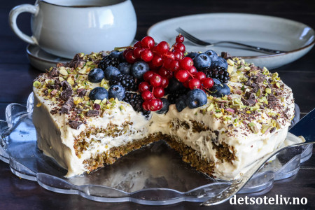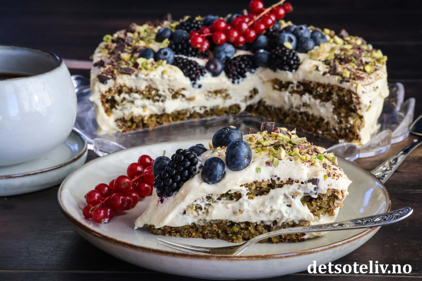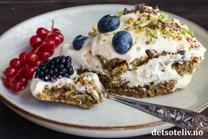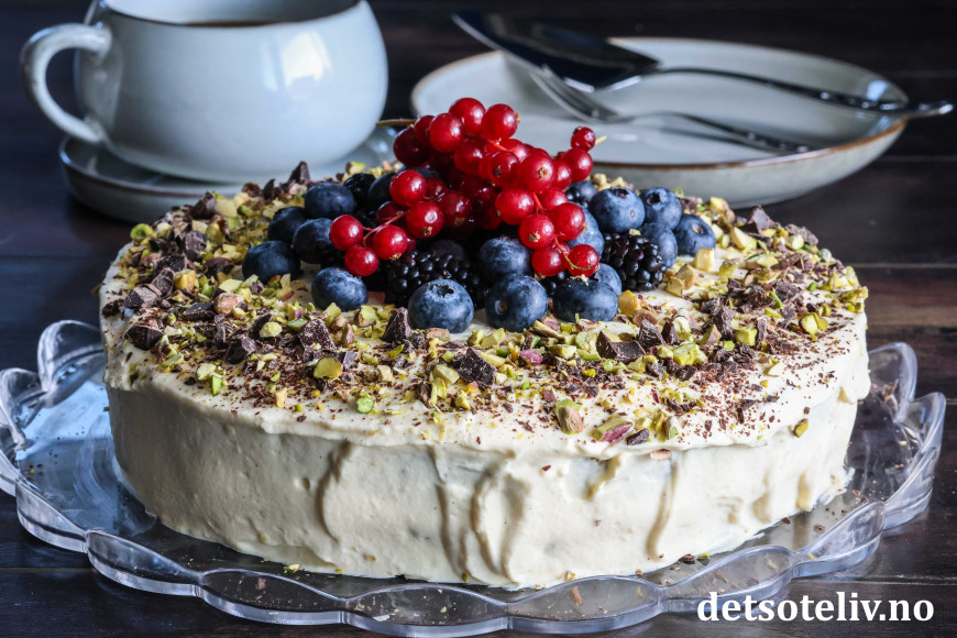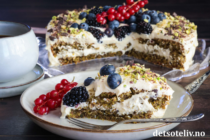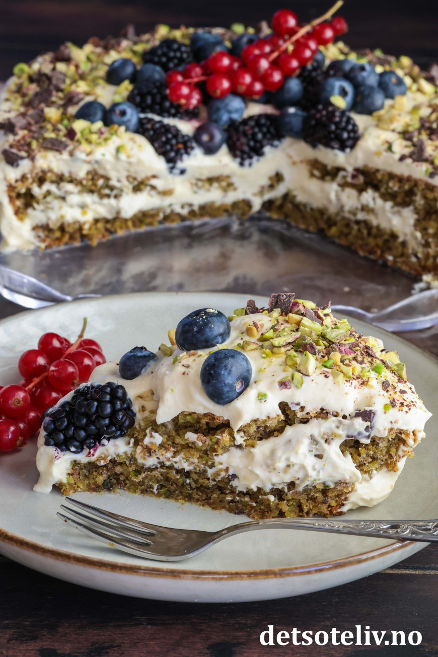 Her får du oppskrift på en kjempegod pistasjkakebunn som lages helt uten hvetemel. Kaken fylles med et tykt lag hjemmelaget vaniljekrem. Vaniljekremen lages ved å først koke en eggekrem som skal stå i kjøleskapet over natten, og deretter blandes sammen med pisket fløtekrem. Vaniljekremen blir luftig og utrolig god!