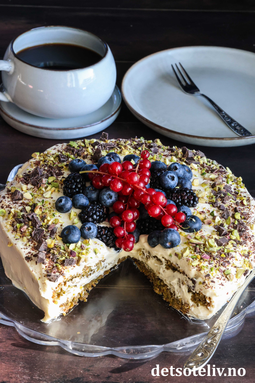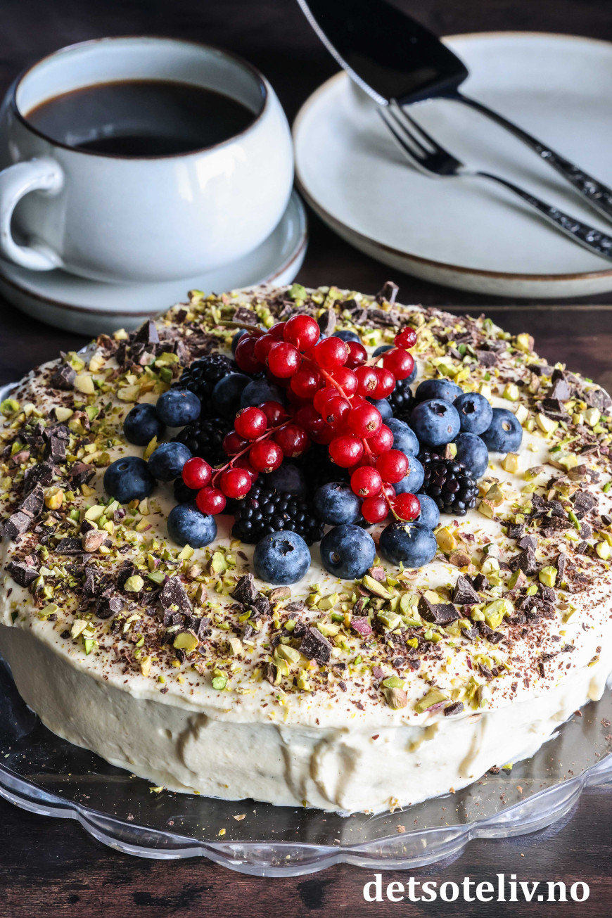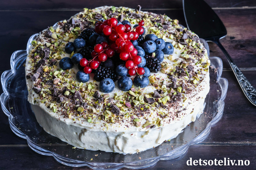 Pynt kaken med hakkede pistasjnøtter, kokesjokolade og friske bær.