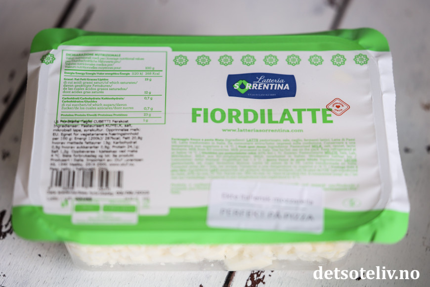 ♥ Jeg brukte her osten Fior di latte, som er populær å bruke som ost på pizza (fås blant annet kjøpt hos Meny og Oda). Denne osten er en mozzarella-variant som er fastere enn fersk mozzarella. Typen jeg brukte her kjøpes ferdig skjært opp i små terninger (mozzarella cubetti).