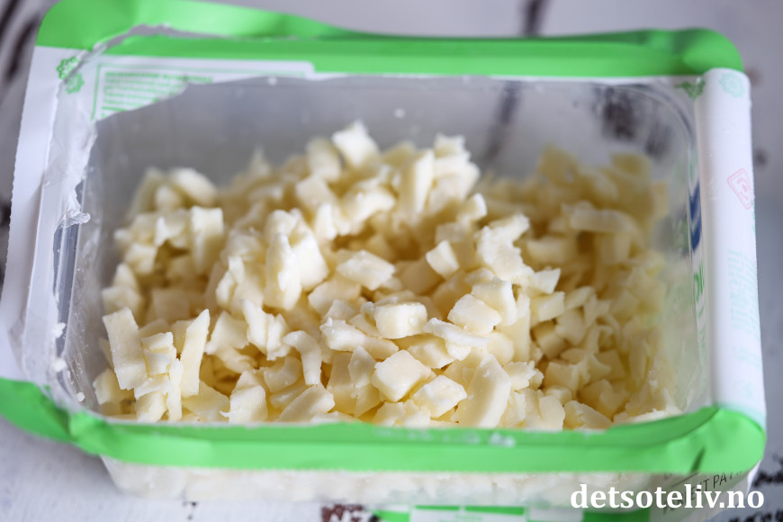 ♥ Jeg brukte her osten Fior di latte, som er populær å bruke som ost på pizza. Denne osten er en mozzarella-variant som er fastere enn fersk mozzarella. Typen jeg brukte her kjøpes ferdig skjært opp i små terninger (mozzarella cubetti). Du kan alternativt bruke små runde kuler av fersk mozzarella. Det går også veldig fint å bruke norsk Norvegia (eller annen gulost) som du skjærer i små terninger.