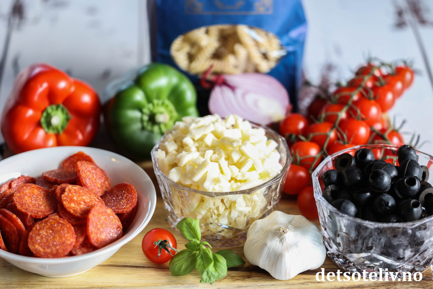 Her blandes pastaskruer med pepperoni, mozzarella, tomater, paprika, rødløk og oliven.