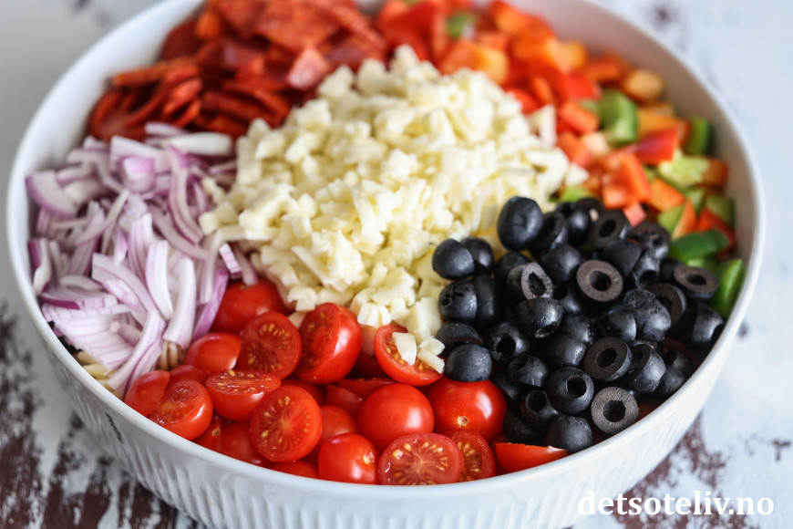 Forbered de andre ingrediensene til salaten: Rens paprika og kutt i mindre biter. Skjær pepperoniskivene i fire. Del cherrytomatene i to og oliven i skiver. Skjær rødløken i tynne skiver. Bland alt sammen i en stor bolle.