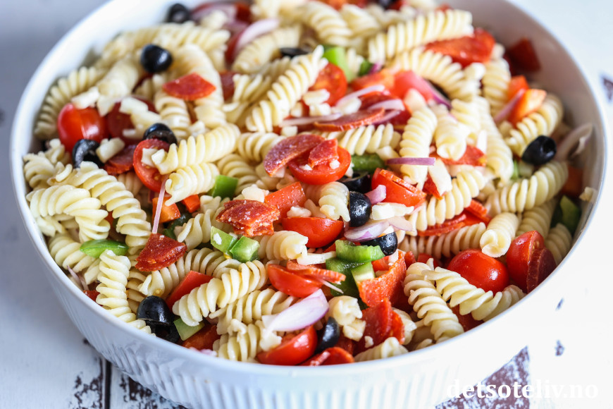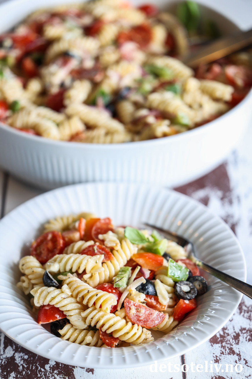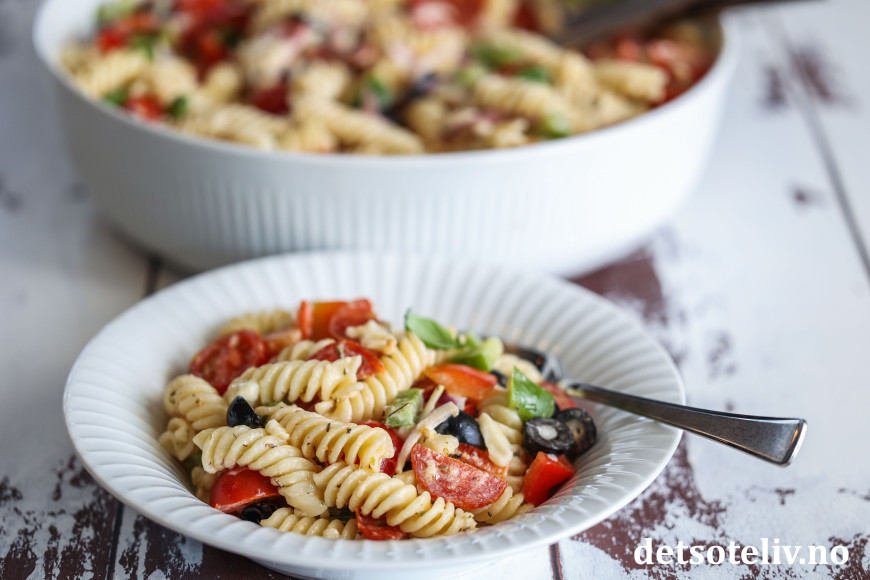 ♥ Pizza pastasalaten kan med fordel stå kjølig i et par timer før servering. Rester kan fint oppbevares i et par dager i kjøleskapet.