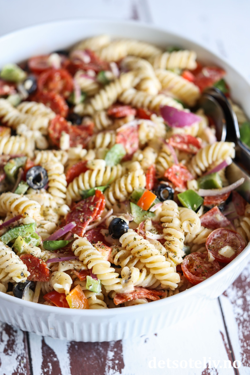 Pizza Pasta Salad er en populær pastasalat som lages med ingredienser som får pastasalaten til å smake pizza! 😍