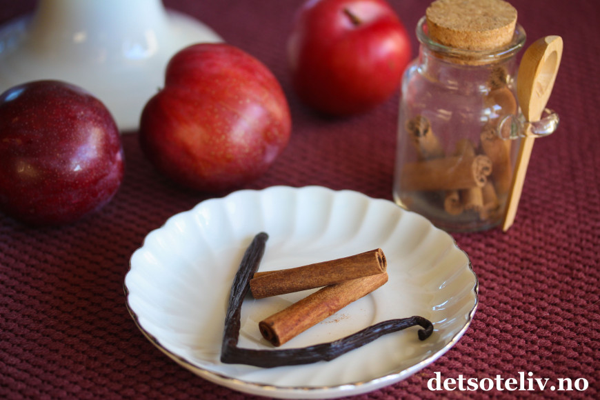 Rens plommene og del dem i båter. Ha plommebåtene i en kjele. Tilsett vann. Ha kanelstangen i kjelen. Snitt opp vaniljestangen og ha både vaniljefrø og vaniljestang i kjelen.