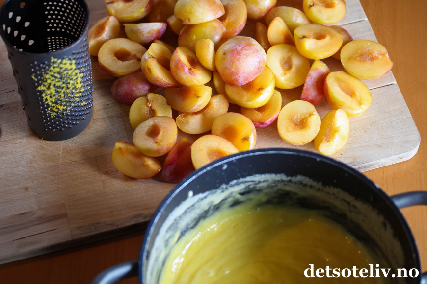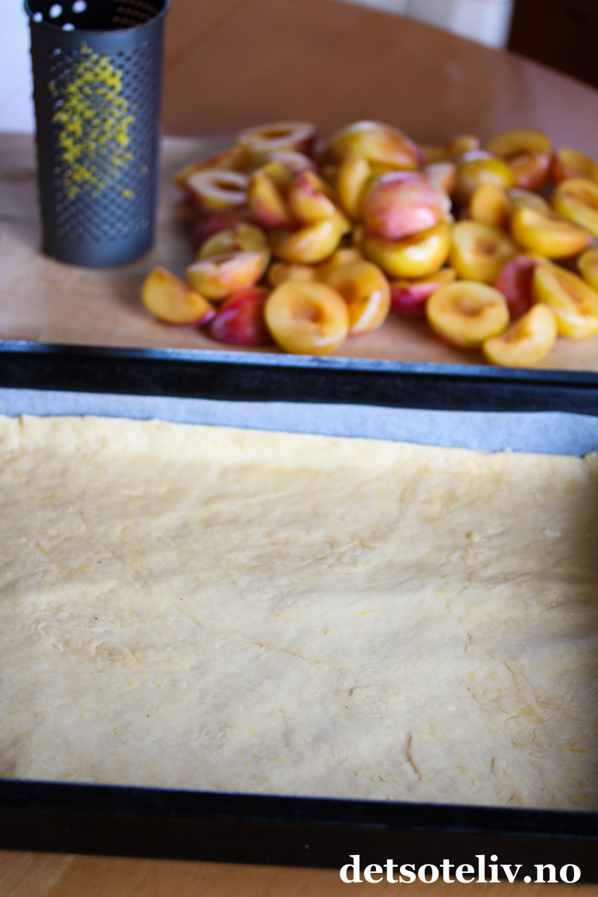 Hjemmelaget vaniljekrem, saftige plommer og revet sitronskall er med på å gi deilig smak på denne kaken!