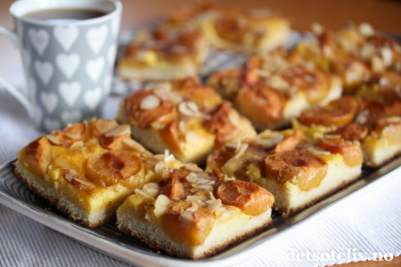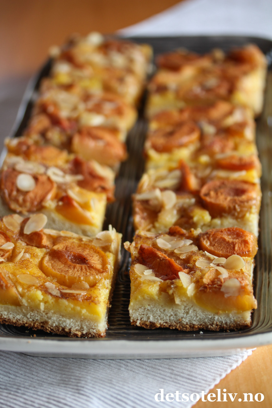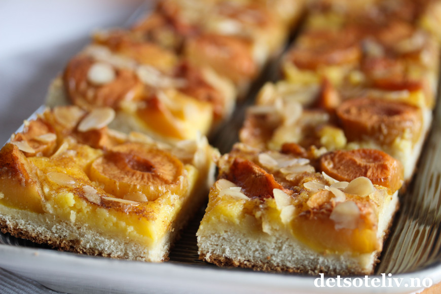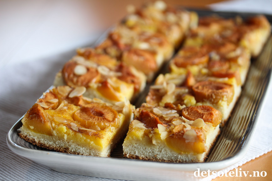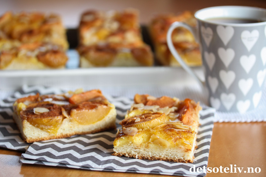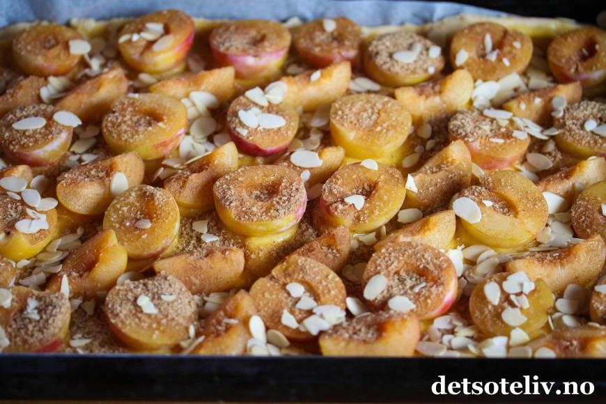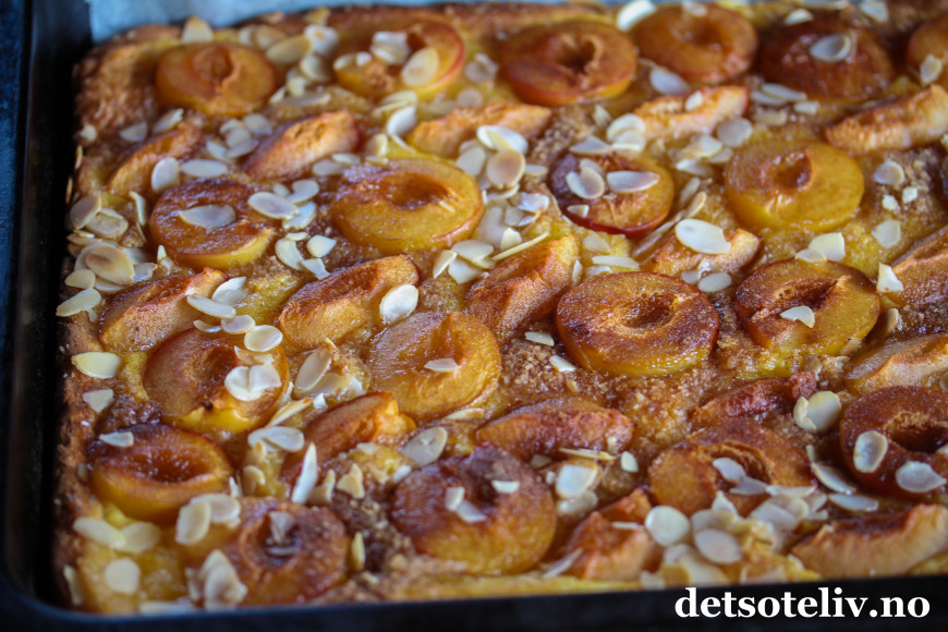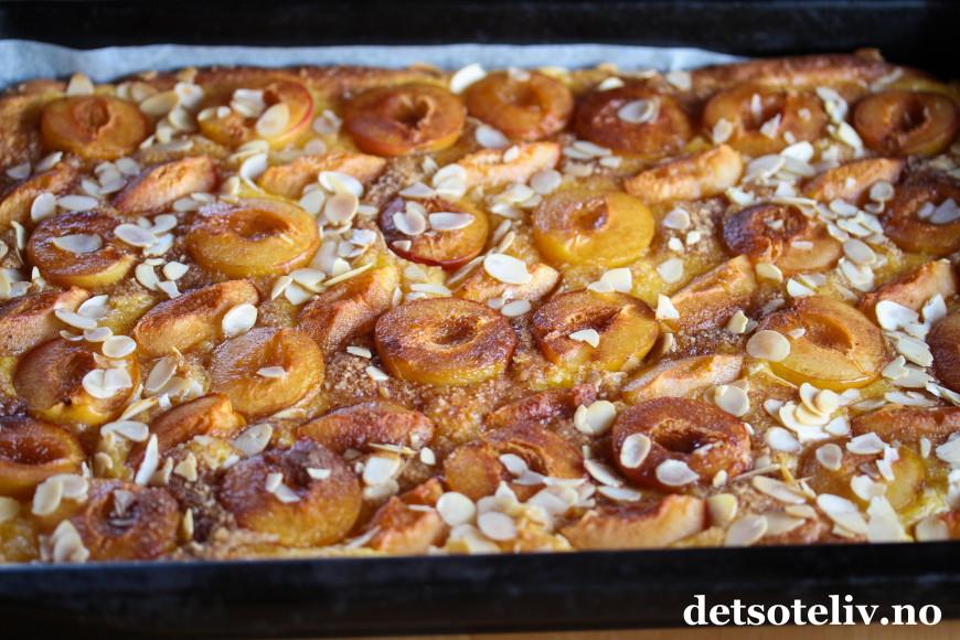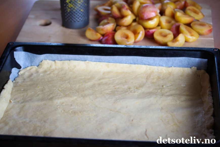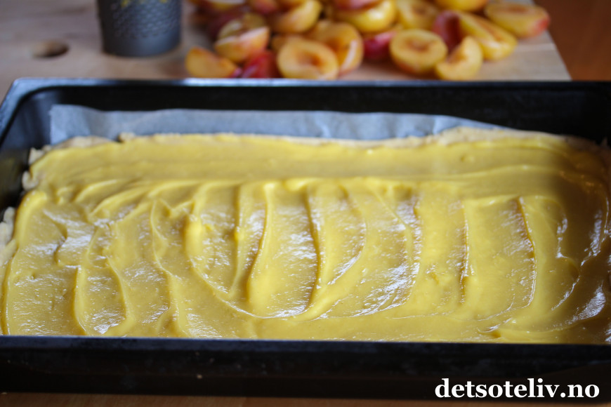 ♥ Se også oppskrift på Zwetschgendatschi (Plommekake fra Bayern), som er en lignende plommekake i langpanne med hvetedeigsbunn, men som har smuldredeig på toppen i stedet for vaniljekrem og krydder.