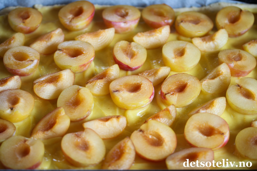 Del plommene på midten og fjern stenene. Legg plommene utover kaken oppå vaniljekremen.