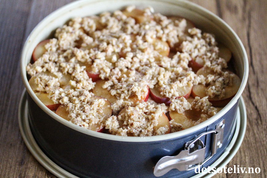 Se også Plommekake i langpanne med mandler og Plommekake med nøttecrumble, som er veldig lik denne kaken, men med hasselnøtter og litt krydder.
