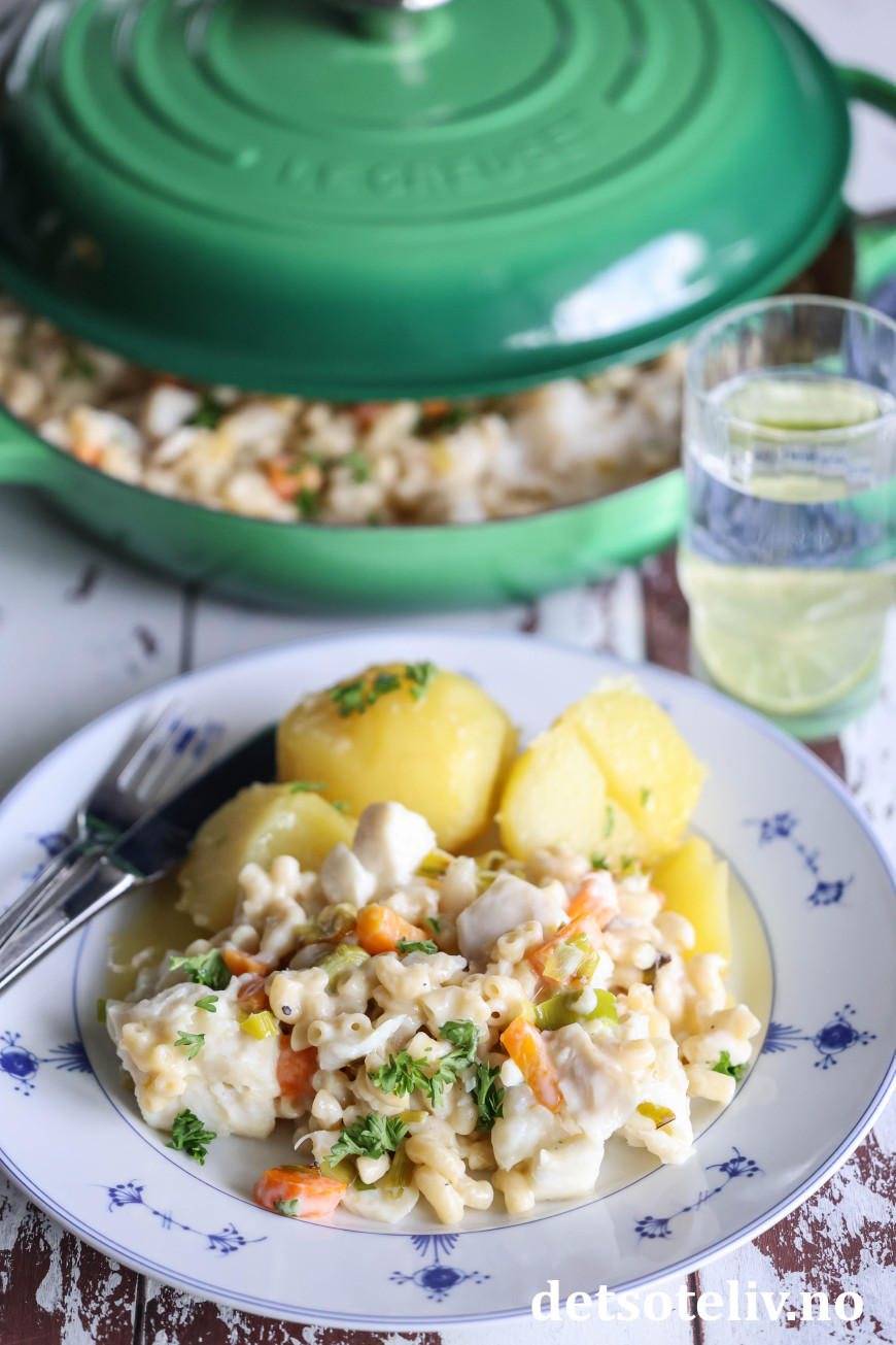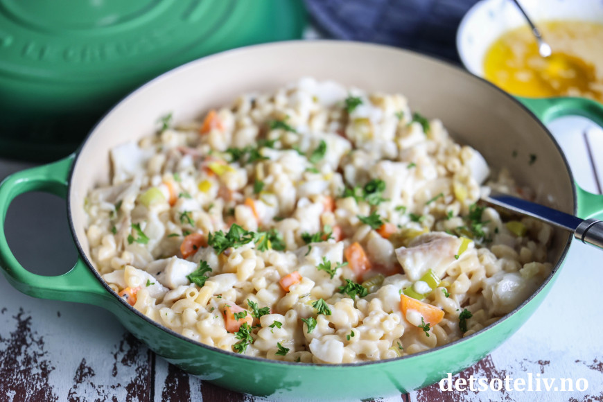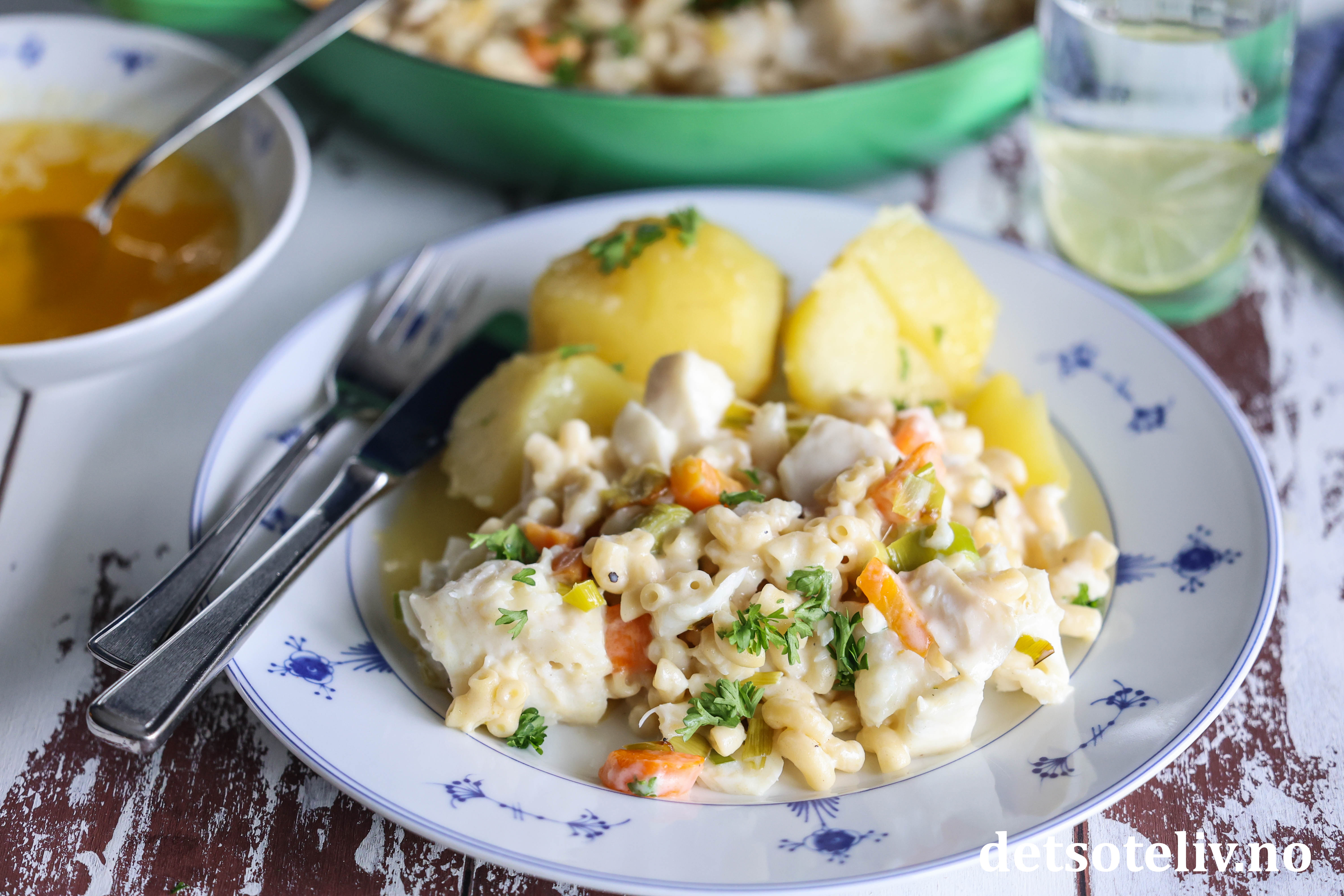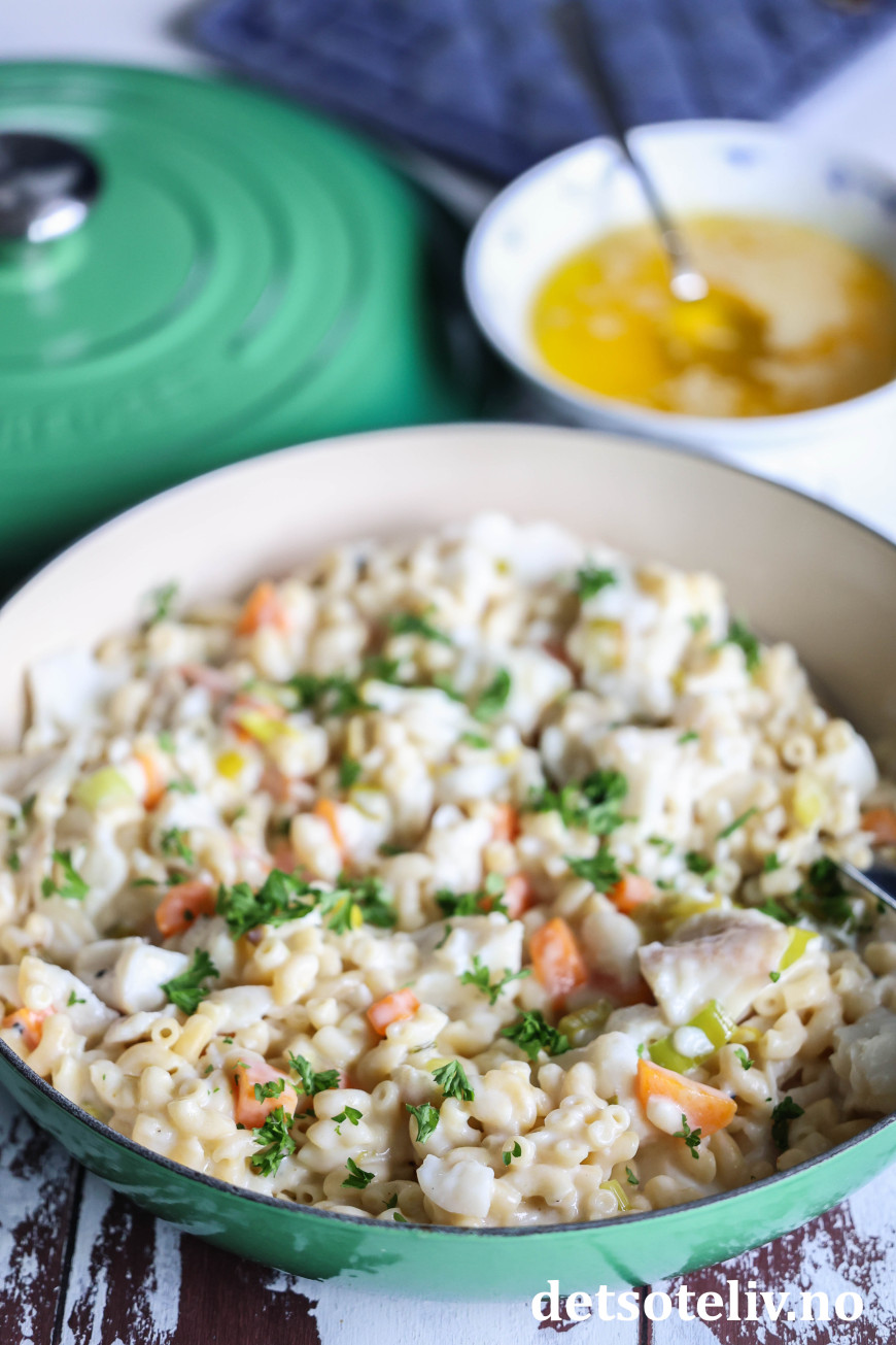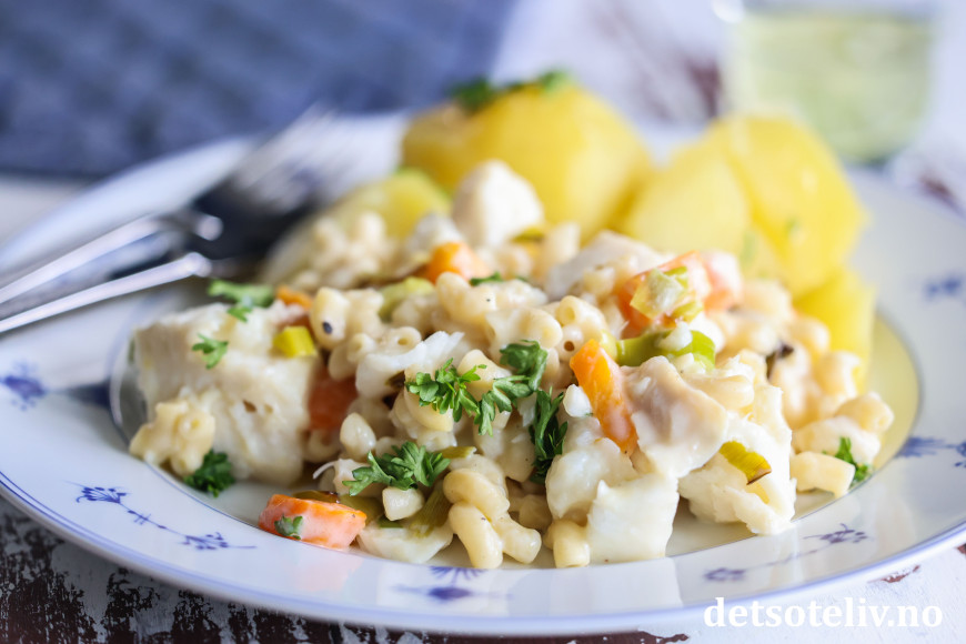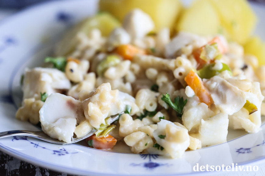 Denne varianten lages dessuten med makaroni, som kan være smart for å få også de minste til å hive seg over fiskemiddagen. 😊