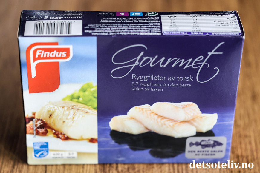 ♥ Jeg brukte her 850 g frossen torskefilet, som fås kjøpt i de fleste matbutikkene (2 pakker av de du ser på bildet nedenfor). Jeg tiner fiskebitene før jeg trekker dem i en kjele med kokende varmt, saltet vann.