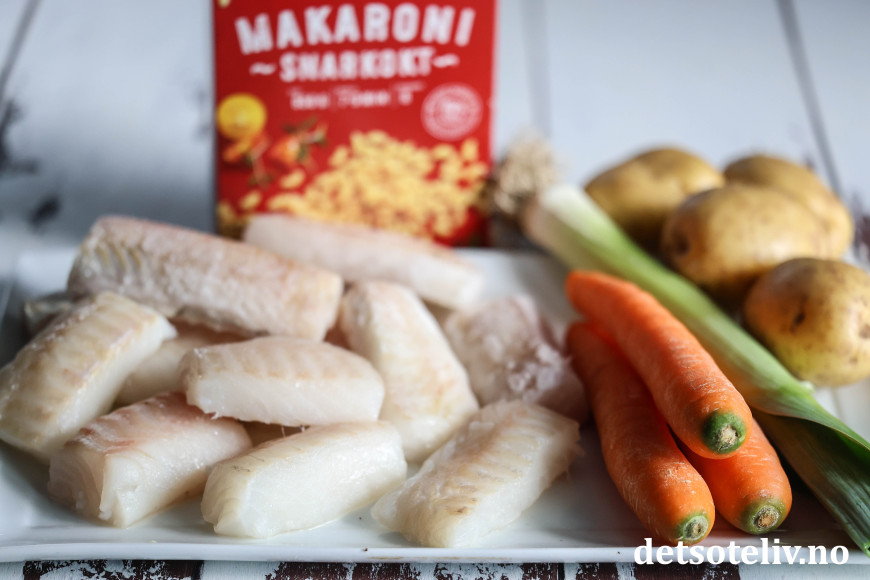 ♥ Planlegg slik at alt blir varmt og klart til servering på samme tid. Det kan være smart å starte med å sette potetene på koking. Deretter trekke fisken og koke makaronien, samtidig som du smørsteker purre og gulrotbitene. Deretter lager du den hvite sausen og holder den varm til potetene er kokt. Da er det bare å blande alt sammen i pannen og servere.