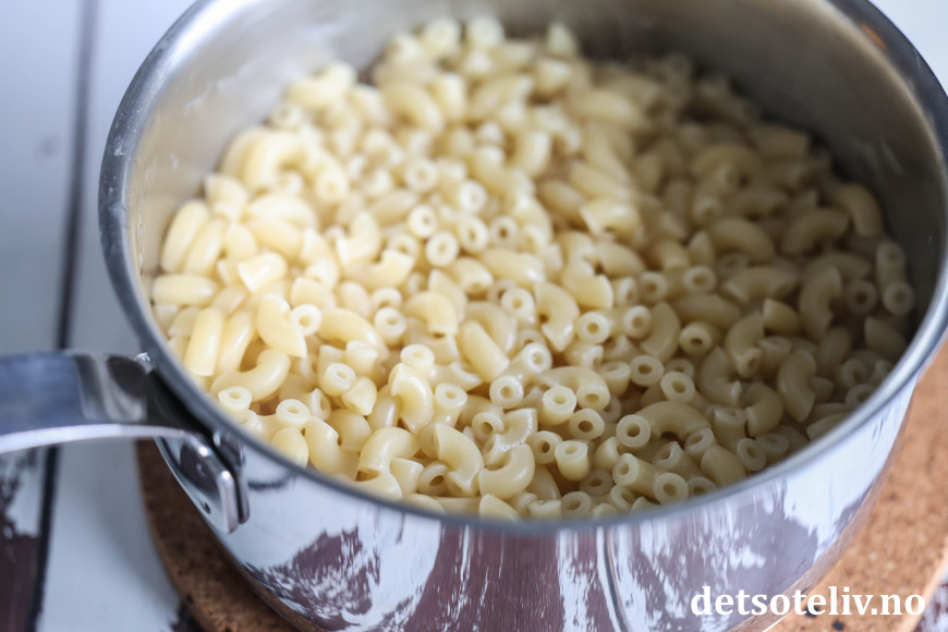Kok makaroni som anvist på pakningen og sil av vannet.