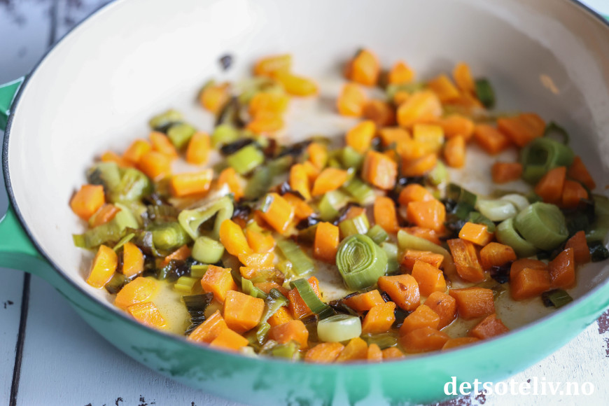 Smelt smøret i en panne. Ha i purre og gulrotbitene og la de surre i smøret på svak varme til bitene blir møre.