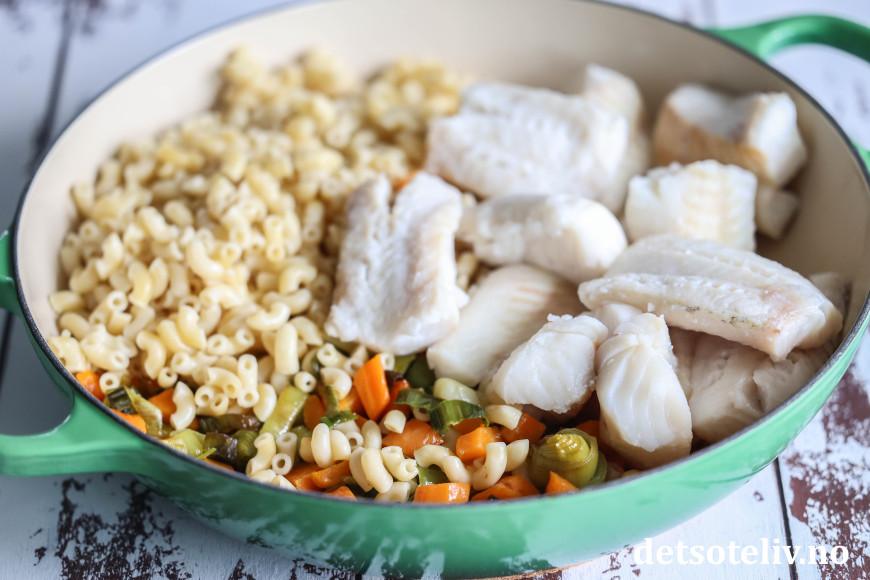 Ha deretter fiskebitene og den kokte makaronien i pannen sammen med grønnsakene.