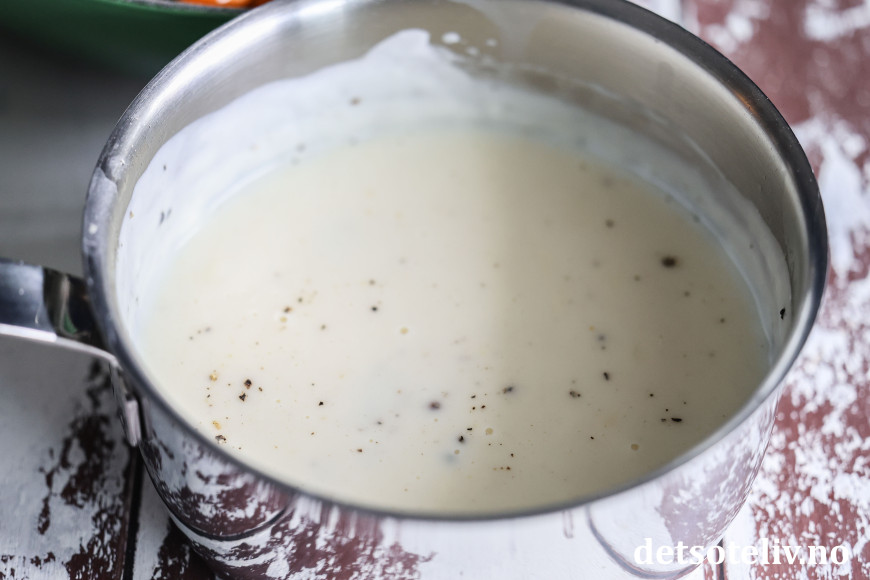 Varm opp sausen på middels varme under omrøring til du ser at den tykner. Ta kjelen av platen og smak til sausen med salt og pepper.