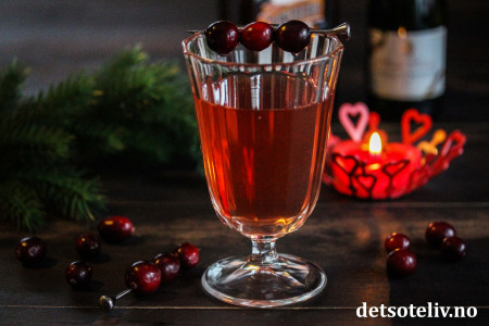 Rett før servering tilsettes champagne. Pynt glasset med friske tranebær.
