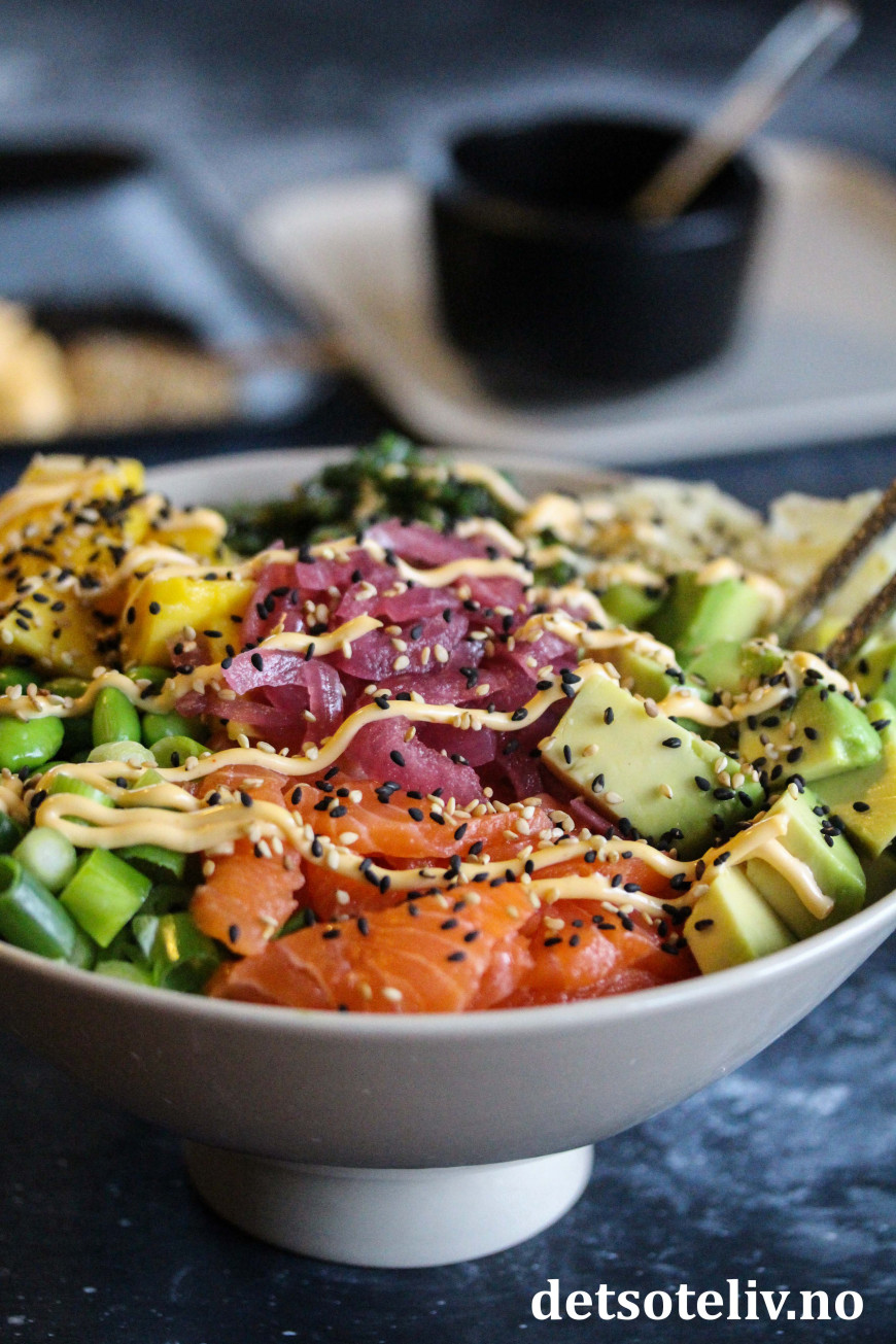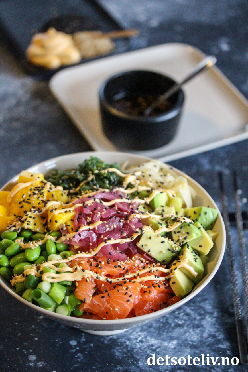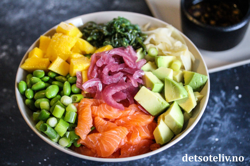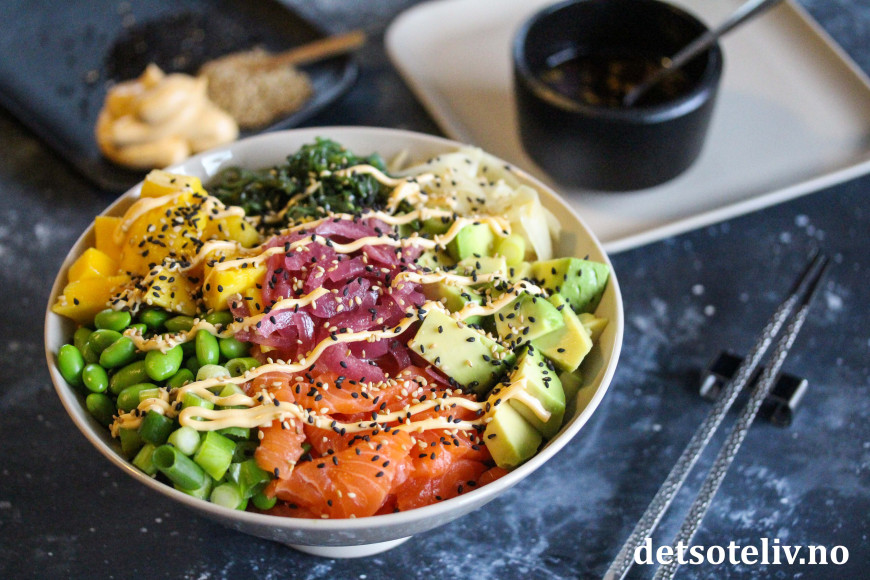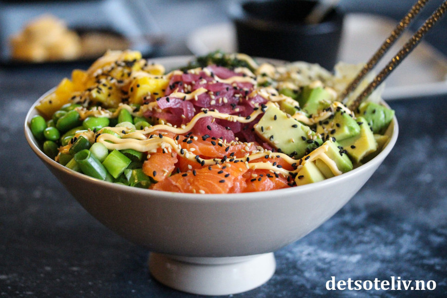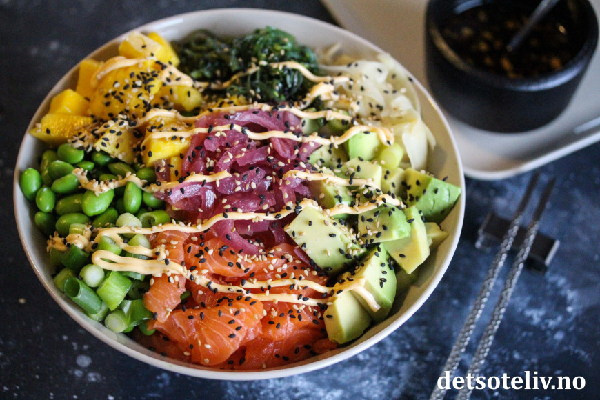 Poké Bowl er superpopulær "street food" fra Hawaii, som har ingredienser og smaker som er kraftig inspirert av japansk sushi, men som serveres i en bolle. Poké uttales "pow-kay" og betyr å kutte noe i små biter på hawaiisk, hvilket nok henspeiler på den fargerike toppingen.