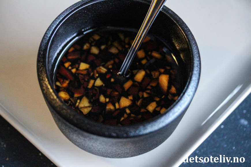 Bland soyasaus med riseddik og presset saft fra lime. Rør inn sukker og sesamolje.