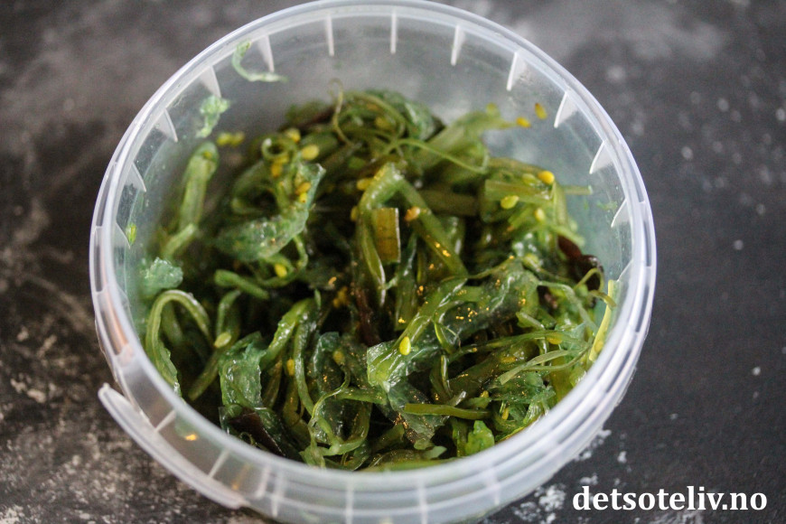 Jeg har her brukt ferdigkjøpt syltet rødløk, syltet ingefær og wakame (ferdigkjøpt sjøgress-salat).