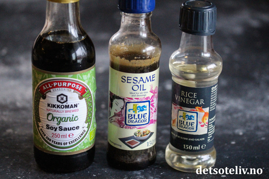 Soyasaus, sesamolje og riseddik får man også kjøpt i de fleste matbutikker: