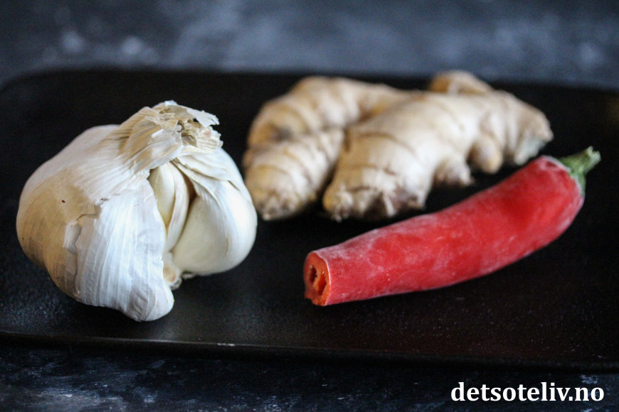 Finhakk hvitløk, ingefær og chili og bland inn.