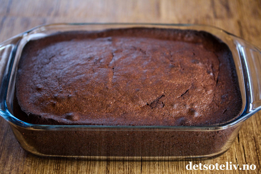 Hell kakedeigen i en smurt, ildfast form. Jeg bruker en avlang form som er ca 20x25 cm, altså noe mindre enn en liten langpanne. Det går også greit å bruke vanlig, liten langpanne, men da blir kaken litt lavere og steketiden kan reduseres noe.