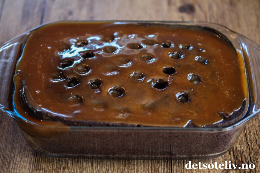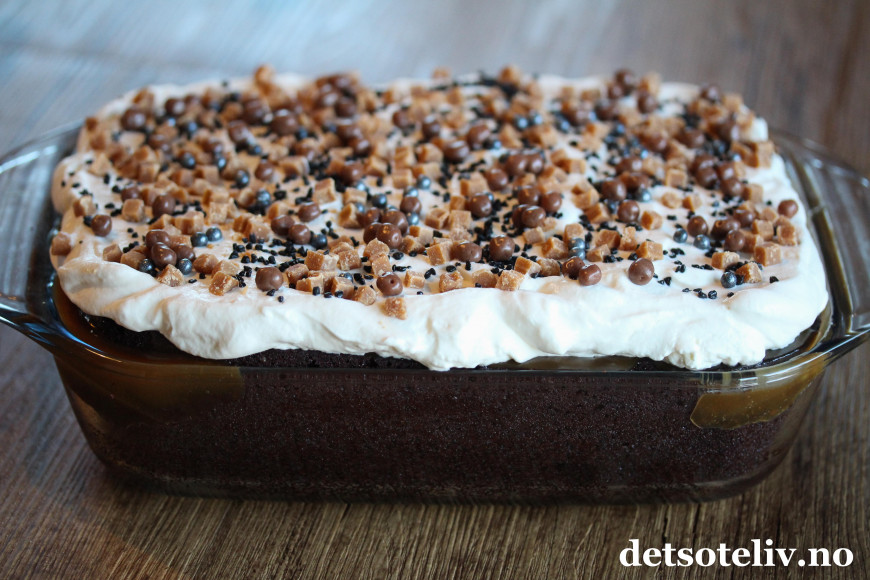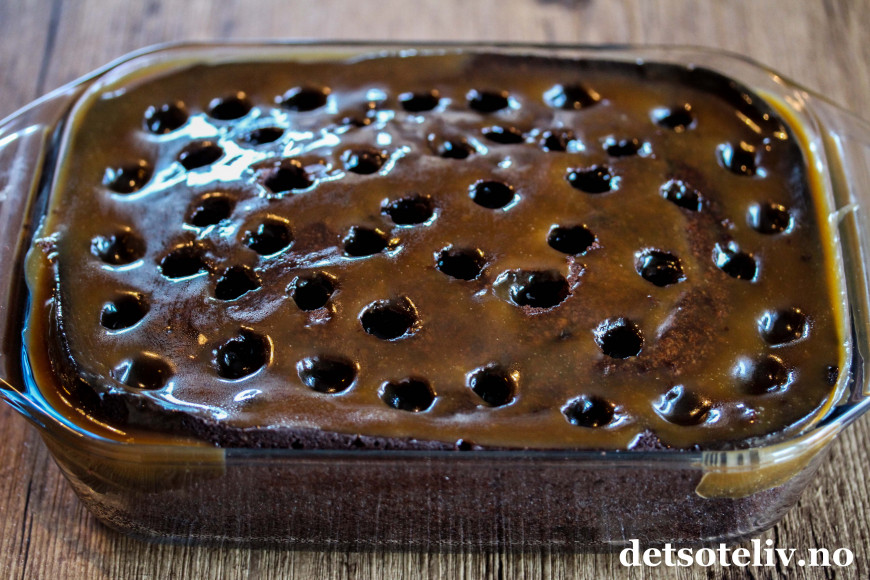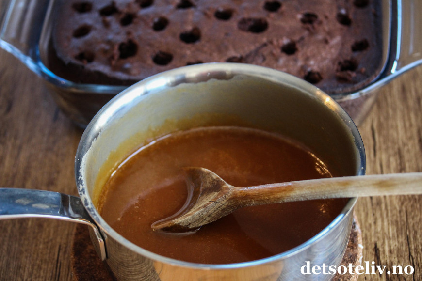 Hell den varme karamellen over kaken. Sett kaken i kjøleskapet i 1 time og la karamellen trekke godt inn i kaken.