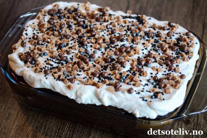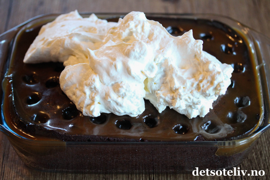 Dette er en saftig sjokoladekake som helles over på denne måten med flytende, varm karamell. På toppen dekkes kaken med pisket krem.