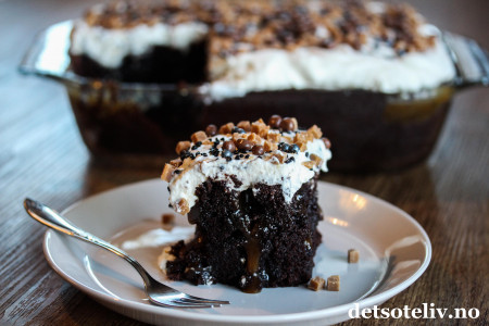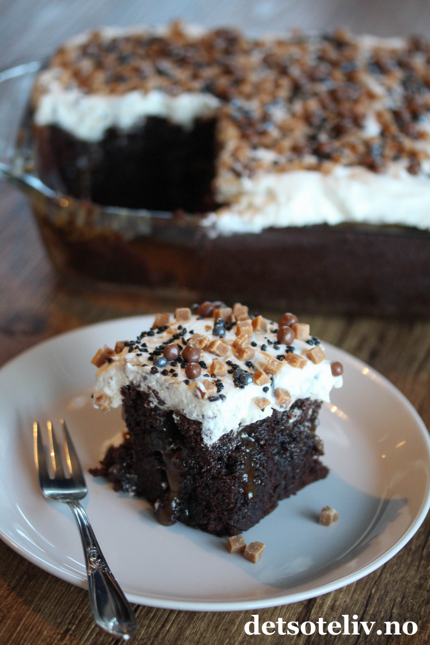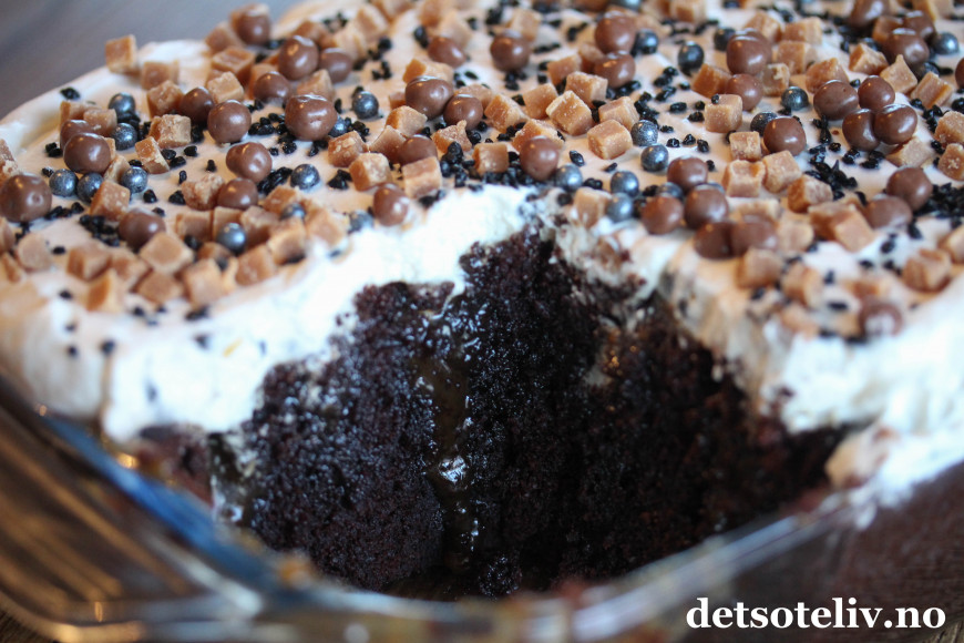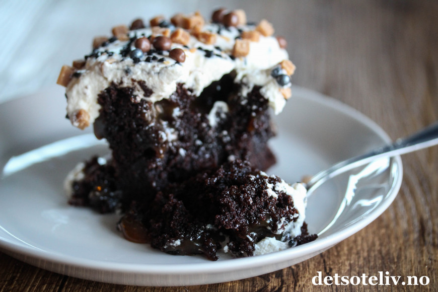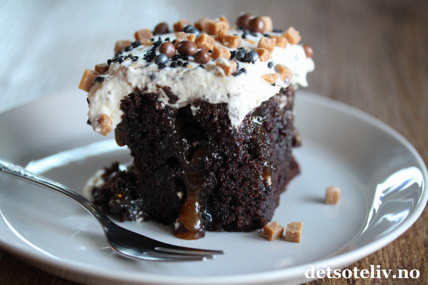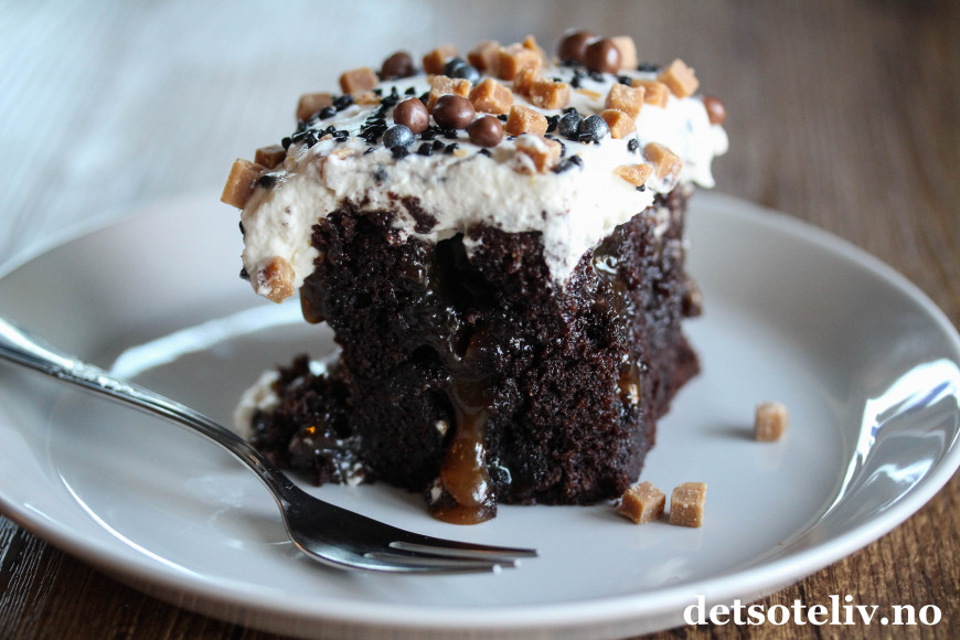 Herlig med en sjokoladekake som er gjennomtrukket av karamell!