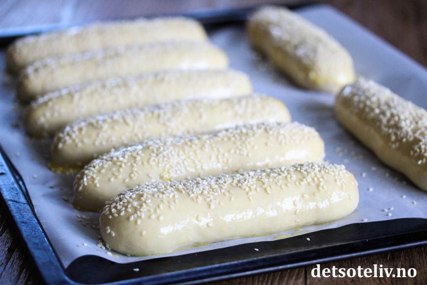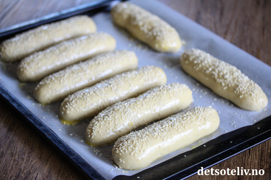 Pensle over lengdene med egg som er pisket lett sammen med litt melk. Dryss over sesamfrø (kan selvfølgelig sløyfes hvis du ikke liker sesamfrø).