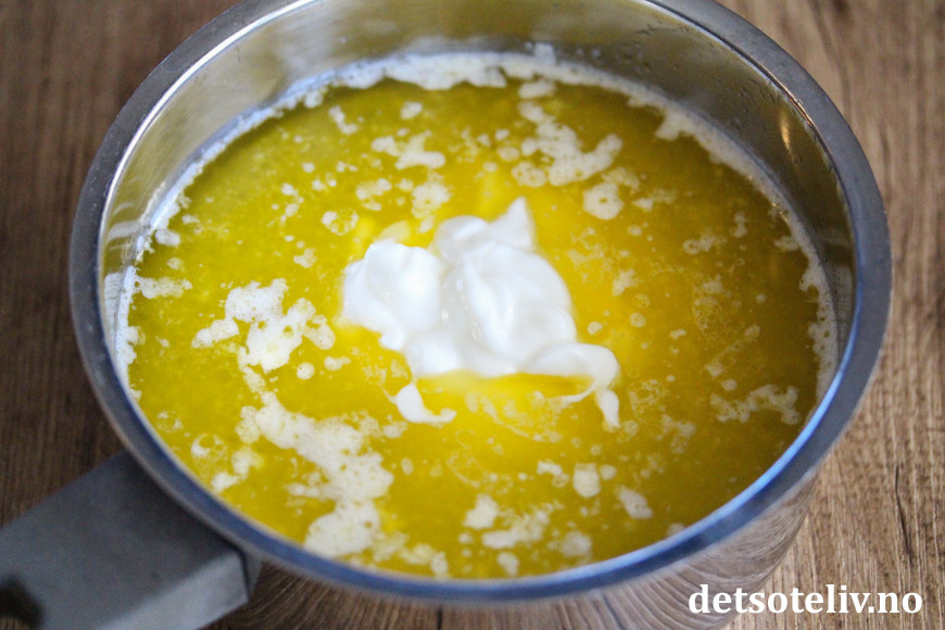 Smelt smøret i en kjele. Tilsett vann og varm opp blandingen til den er lunken (fingervarm). Ta kjelen av platen og rør deretter inn yoghurt naturell (dette avkjøler væsken noe).