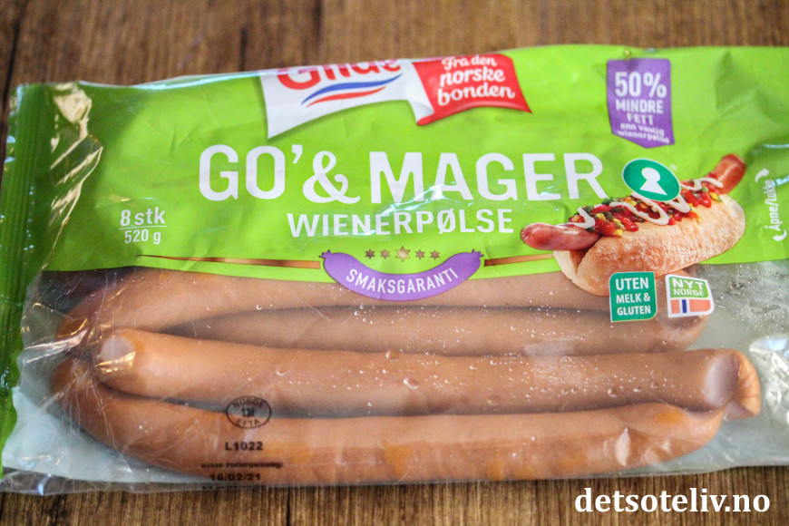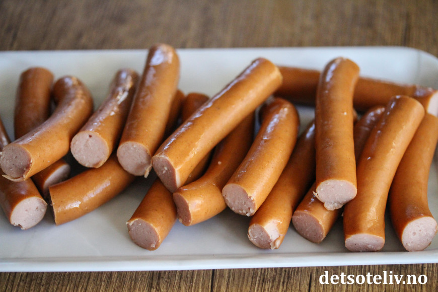 ♥ Jeg brukte her wienerpølser, og da blir det passe størrelse på dem hvis du deler dem på midten.