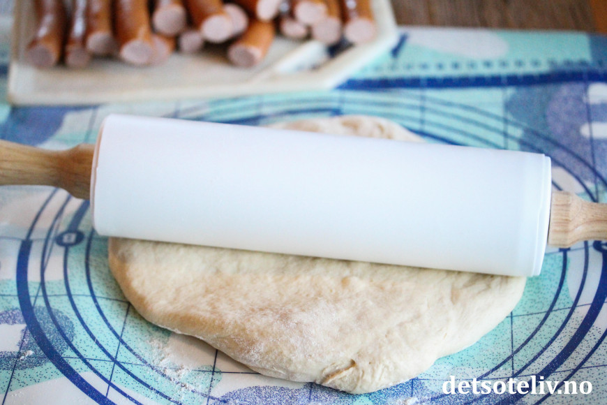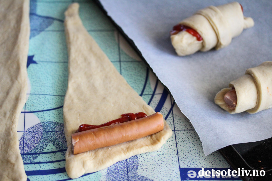 Rull deigen stramt rundt pølsene, så du får hornfasong.