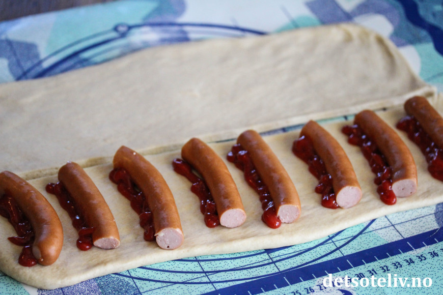 Legg de halve pølsene utover den ene halvdelen av firkanten og ha litt ketchup langsmed hver pølsebit.