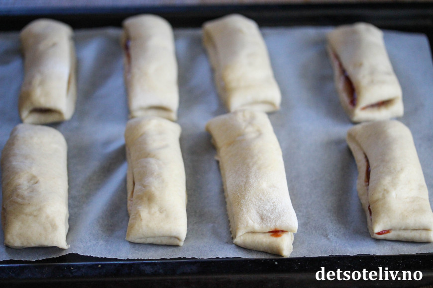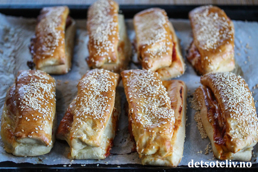 Etterhev i 45 minutter. Stek pølsehornene midt i ovnen ved 200 °C i 12-15 minutter, til de er gylne og gjennomstekte.