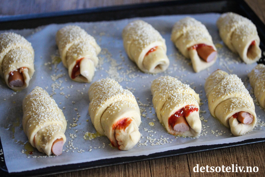 Rull deigen stramt rundt pølsene, så du får hornfasong. Legg dem på bakepapirdekkede stekeplater.