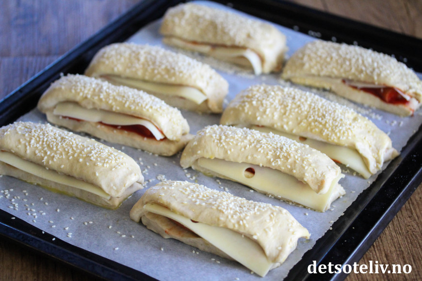 PS: Hvis du vil, kan du gjøre som meg og åpne dem opp igjen og legge noen osteskiver over hver pølse...