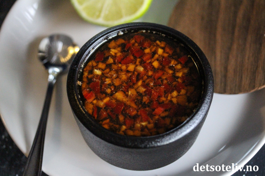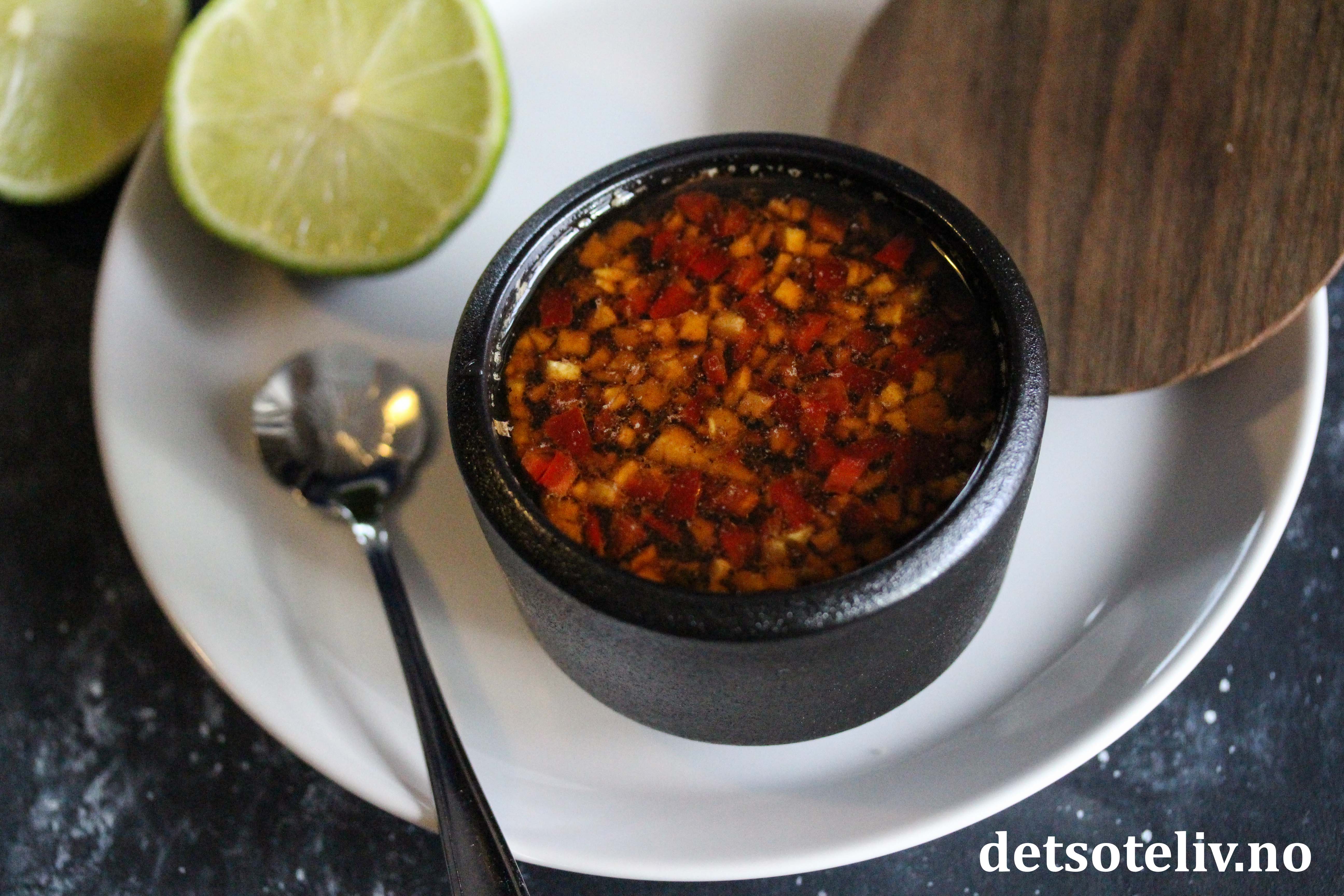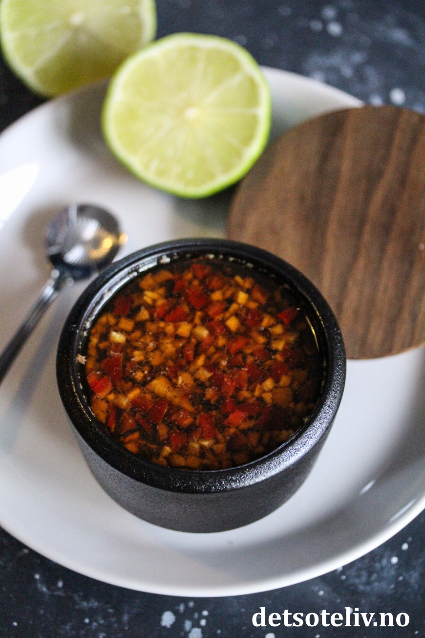 Basen i sausen er soyasaus, som smaksettes med lime, riseddik, sesamolje, ingefær, hvitløk og chili.