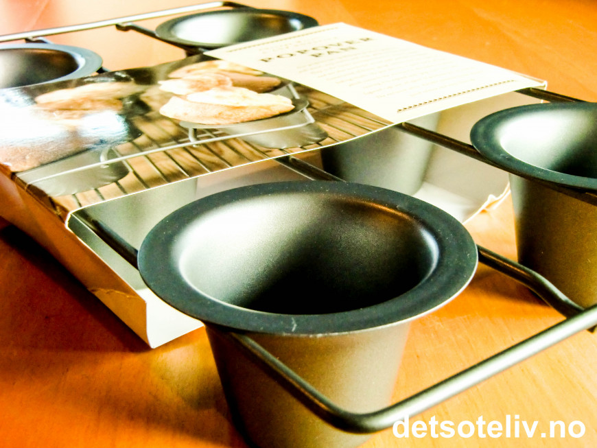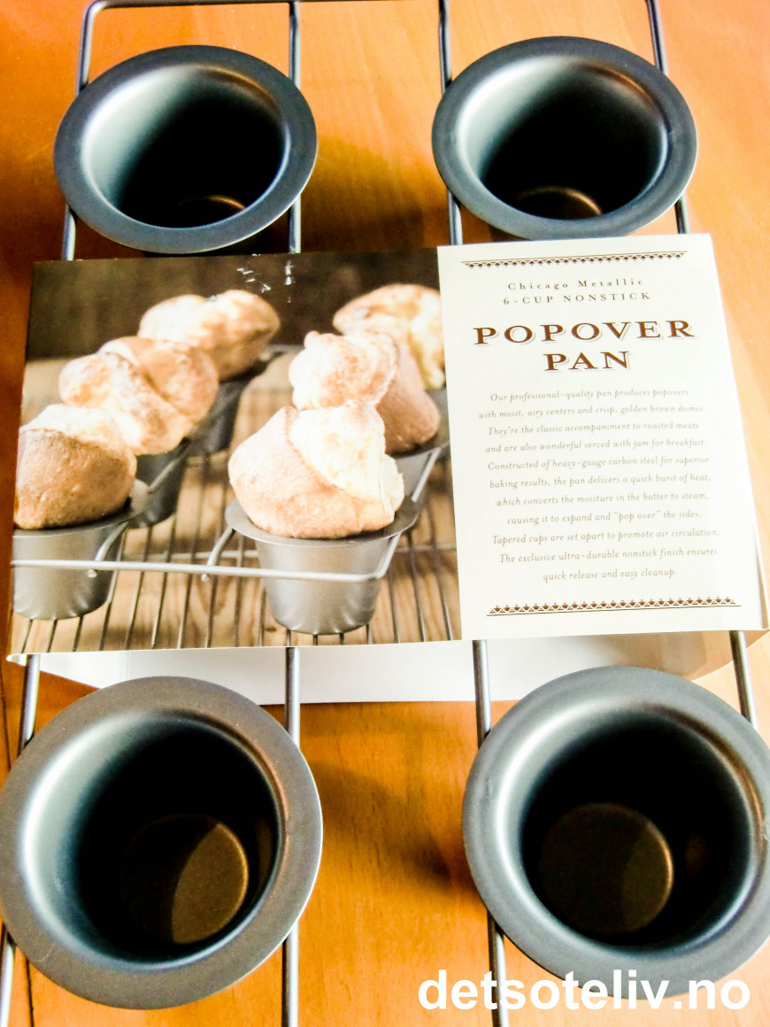 Om du ikke finner en ekte "Popover Pan", er et veldig godt tips "Muffinsbrett Ex Large Muffins" som også har høye kanter og ligner svært. Fås blant annet kjøpt i nettbutikken til www.cacas.no.