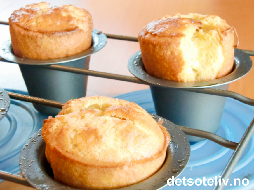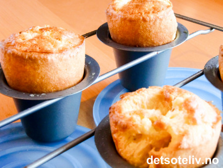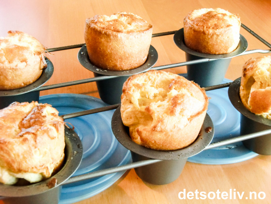Jeg har her brukt en ekte "Popover Pan" som jeg har kjøpt i Amerika og som ser ut som muffinsformer med ekstra høye kanter, men det går også greit å bruke vanlig muffinsbrett.