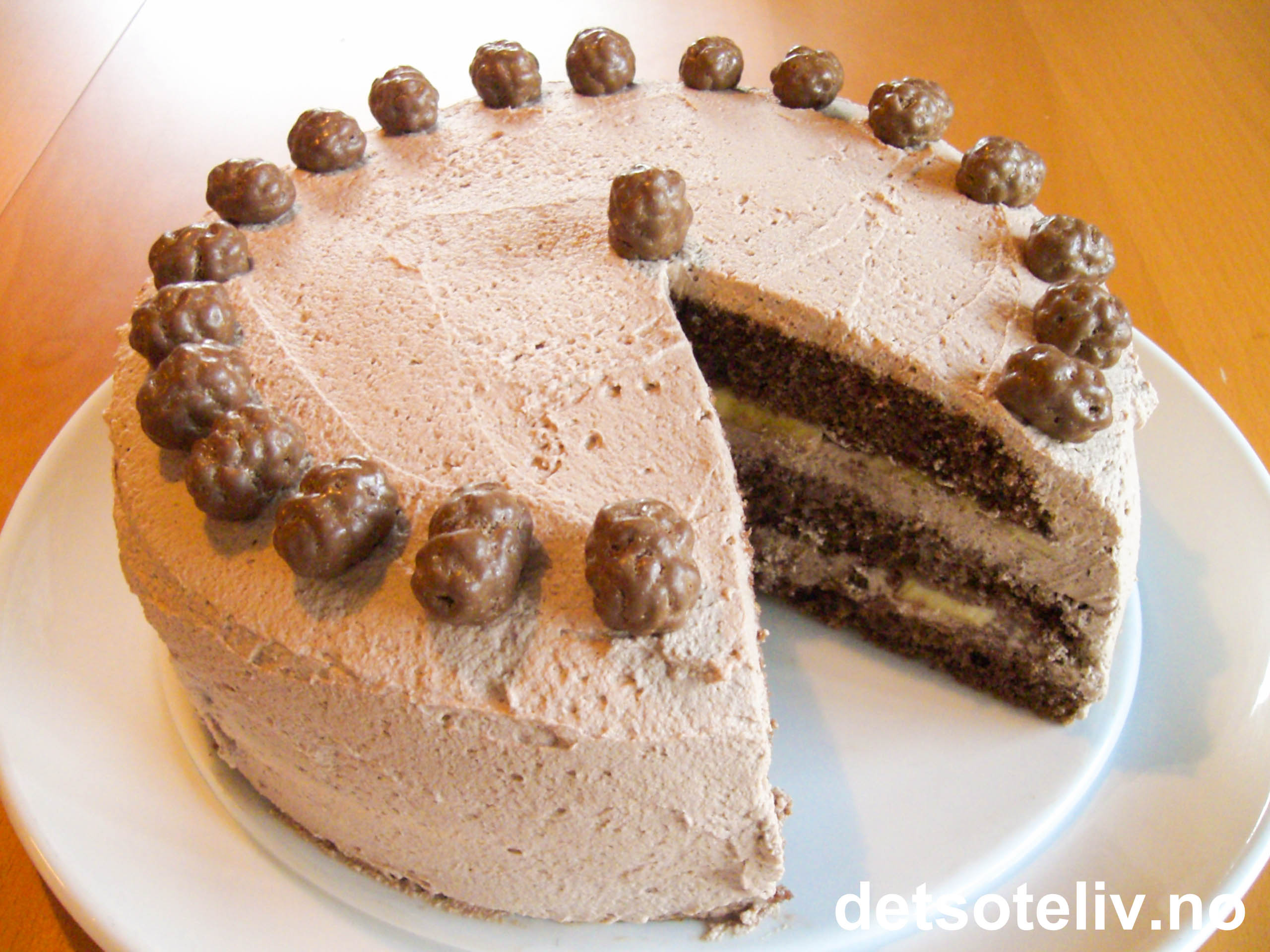 Ha sjokoladekremen med den hakkede sjokoladen mellom kakebunnene. Dekk kaken med resten av sjokoladekremen. Pynt med 'Pops'.