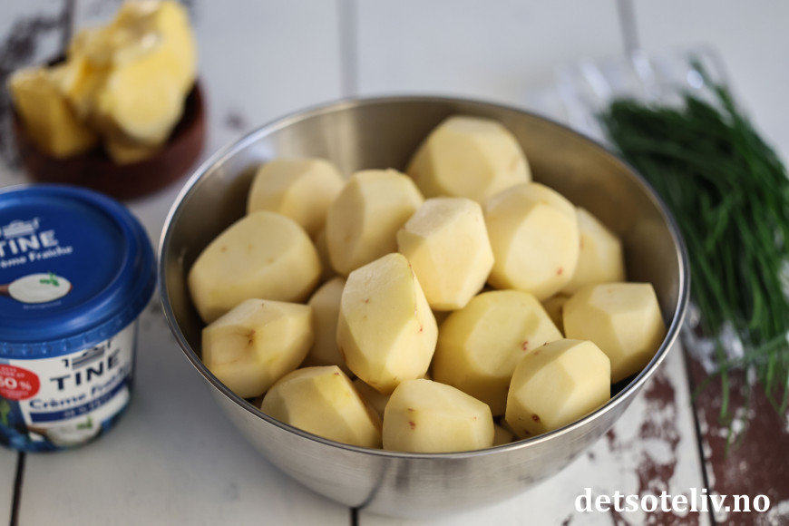 Skrell potetene og del dem opp i litt mindre biter. Ha dem i en kjele. Fyll opp kjelen med vann så vannet dekker potetbitene godt. NB! Ikke ha salt i vannet.