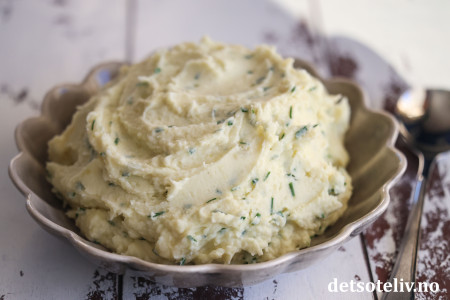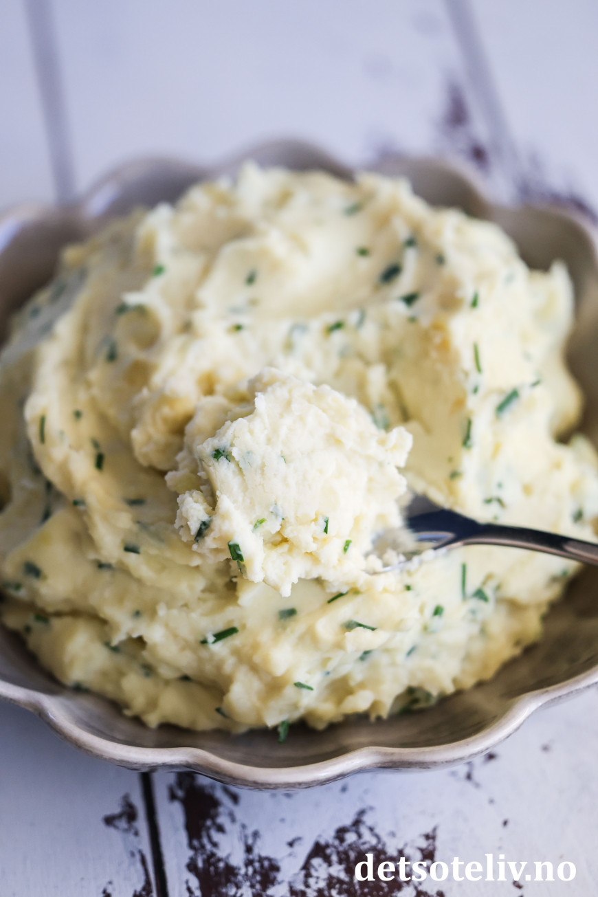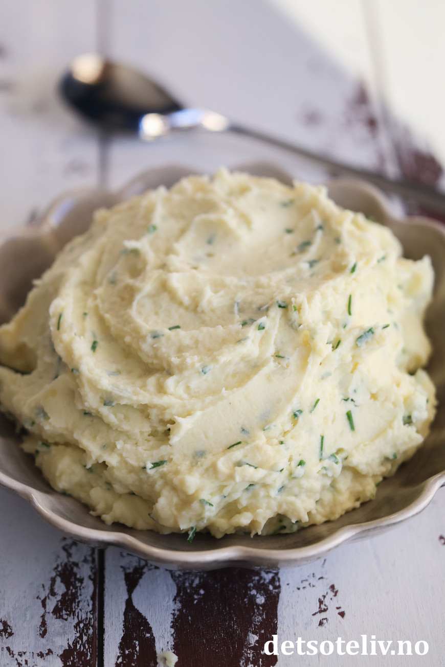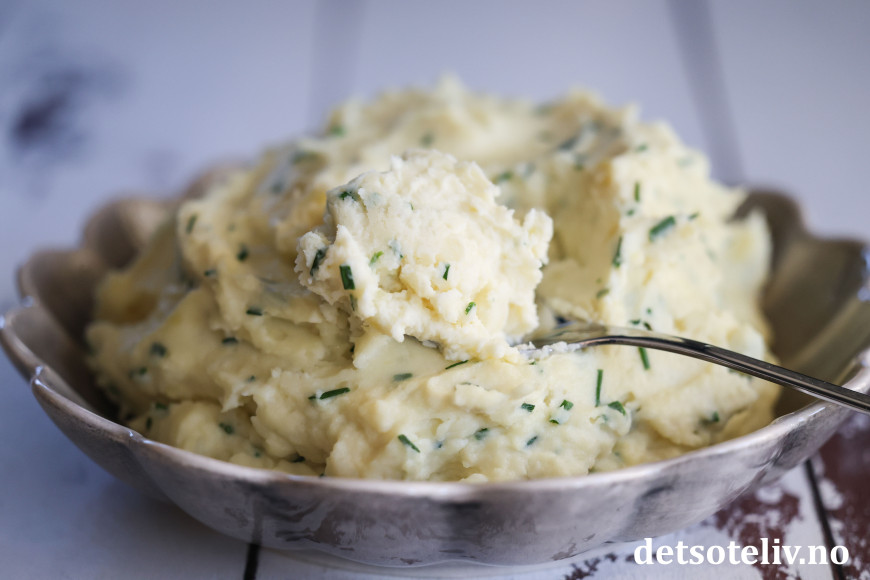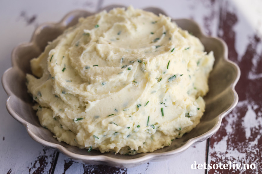 Her er en kjempegod variant der noe av melken er byttet ut med crème fraîche, som gjør potetmosen ekstra fyldig.