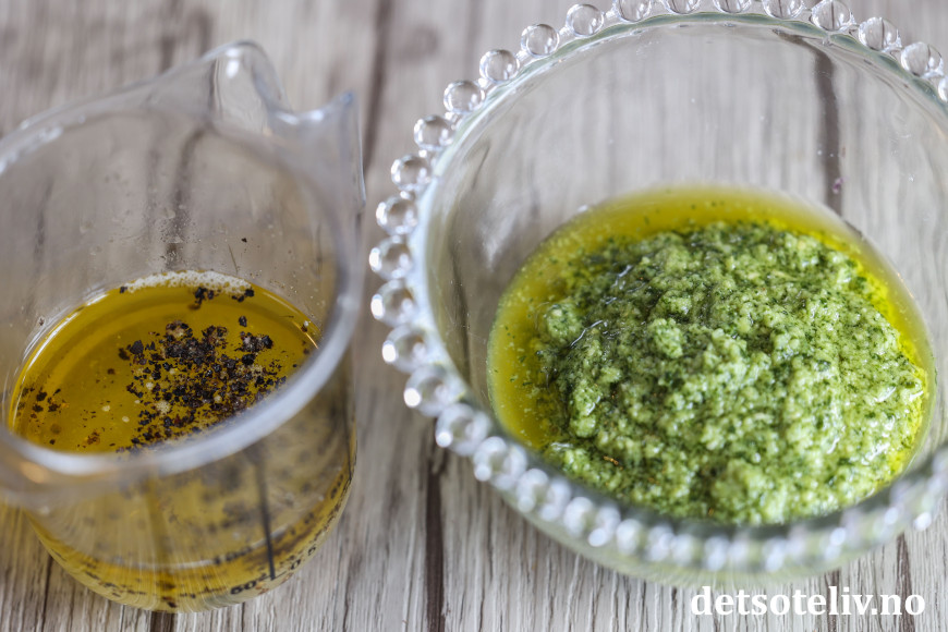 Ha de øvrige ingrediensene til dressingen i en annen skål. Bland dette sammen med pestoen så du får en herlig pestodressing.