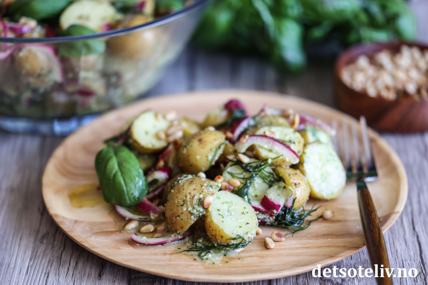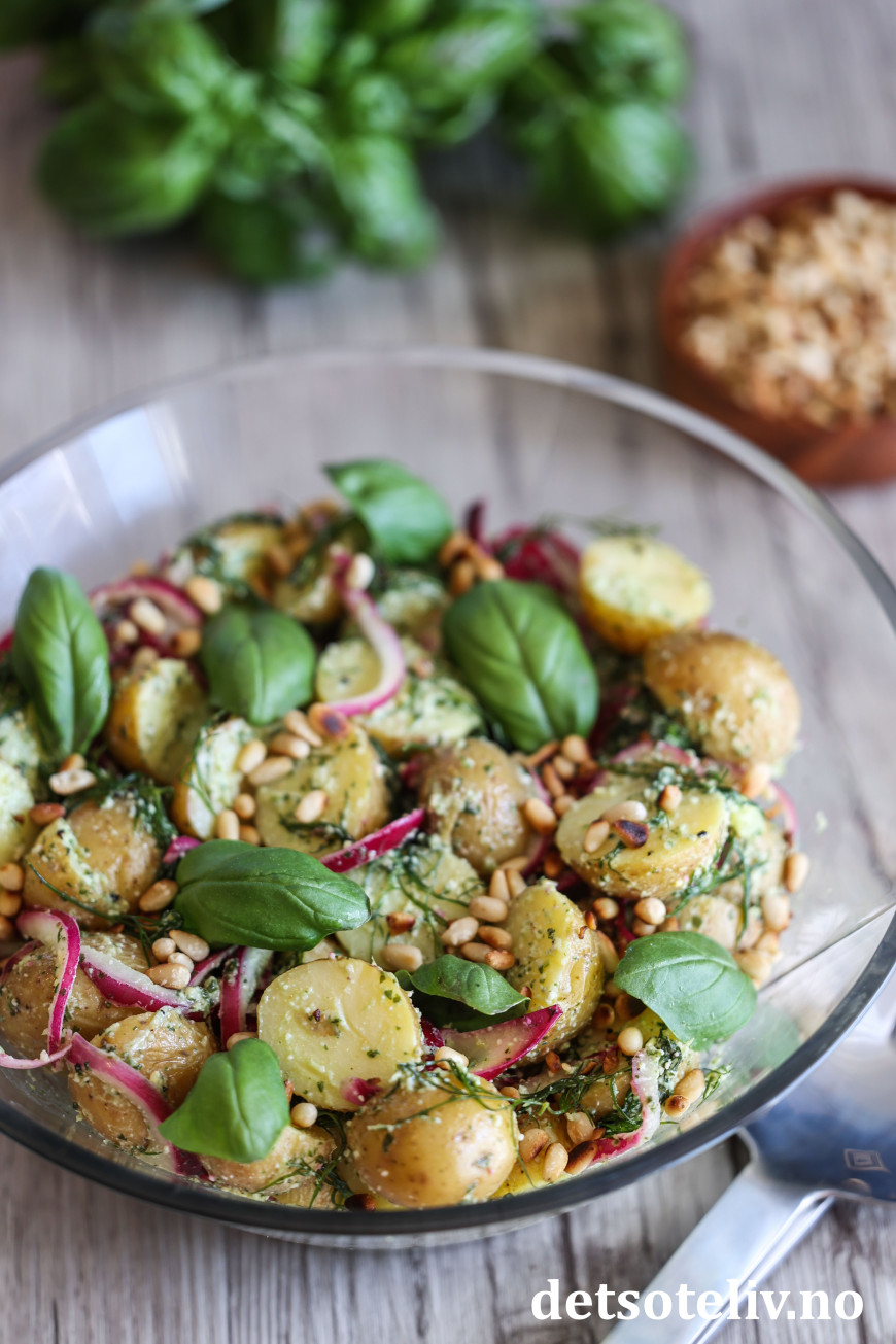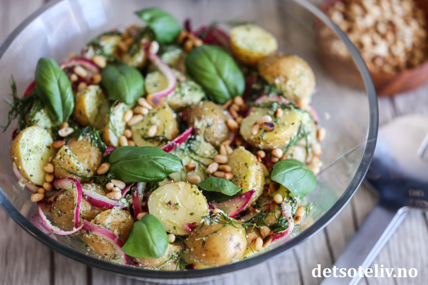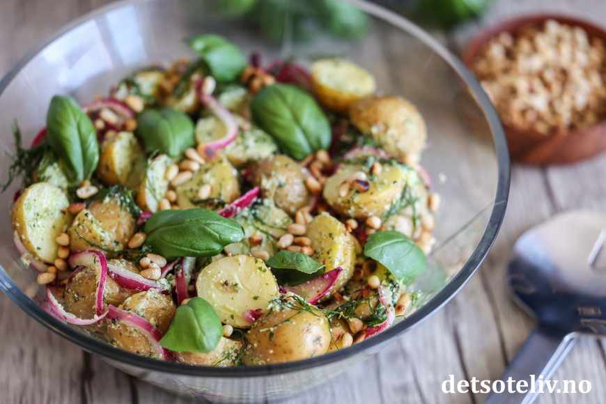 Her vendes kokte nypoteter, rødløk og masse dill sammen med en deilig pestodressing. På toppen drysses ristede pinjekjerner og frisk basilikum.